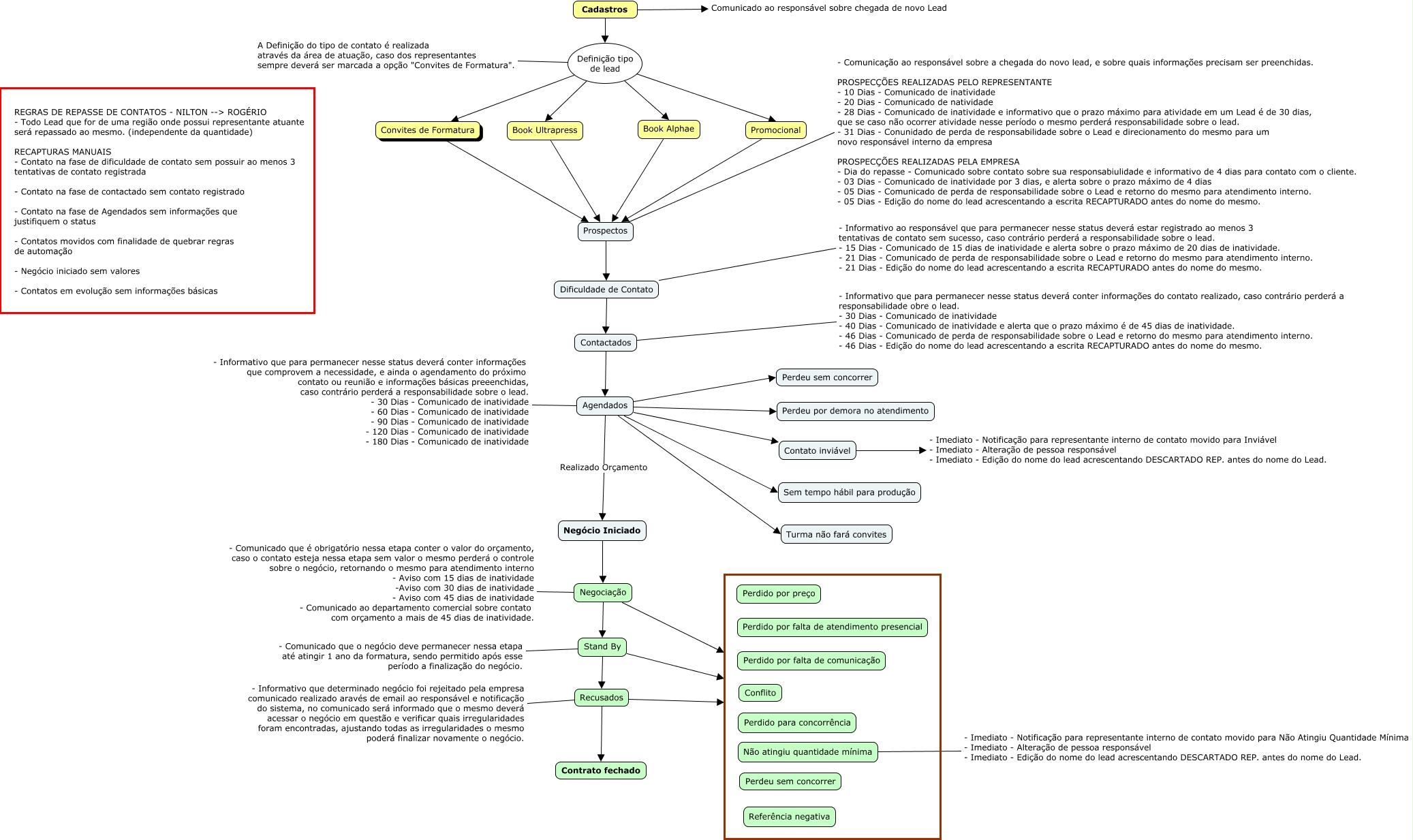 Esse mapa conceitual, produzido no IHMC CmapTools, tem a informação relacionada a: FLUXO CONVITES DE FORMATURA - BITRIX, Definição tipo de lead A Definição do tipo de contato é realizada através da área de atuação, caso dos representantes sempre deverá ser marcada a opção "Convites de Formatura"., Contactados Agendados, Book Alphae Prospectos, Negociação - Comunicado que é obrigatório nessa etapa conter o valor do orçamento, caso o contato esteja nessa etapa sem valor o mesmo perderá o controle sobre o negócio, retornando o mesmo para atendimento interno - Aviso com 15 dias de inatividade -Aviso com 30 dias de inatividade - Aviso com 45 dias de inatividade - Comunicado ao departamento comercial sobre contato com orçamento a mais de 45 dias de inatividade., Contactados - Informativo que para permanecer nesse status deverá conter informações do contato realizado, caso contrário perderá a responsabilidade obre o lead. - 30 Dias - Comunicado de inatividade - 40 Dias - Comunicado de inatividade e alerta que o prazo máximo é de 45 dias de inatividade. - 46 Dias - Comunicado de perda de responsabilidade sobre o Lead e retorno do mesmo para atendimento interno. - 46 Dias - Edição do nome do lead acrescentando a escrita RECAPTURADO antes do nome do mesmo., Agendados Realizado Orçamento Negócio Iniciado, Stand By Recusados, Não atingiu quantidade mínima - Imediato - Notificação para representante interno de contato movido para Não Atingiu Quantidade Mínima - Imediato - Alteração de pessoa responsável - Imediato - Edição do nome do lead acrescentando DESCARTADO REP. antes do nome do Lead., Dificuldade de Contato - Informativo ao responsável que para permanecer nesse status deverá estar registrado ao menos 3 tentativas de contato sem sucesso, caso contrário perderá a responsabilidade sobre o lead. - 15 Dias - Comunicado de 15 dias de inatividade e alerta sobre o prazo máximo de 20 dias de inatividade. - 21 Dias - Comunicado de perda de responsabilidade sobre o Lead e retorno do mesmo para atendimento interno. - 21 Dias - Edição do nome do lead acrescentando a escrita RECAPTURADO antes do nome do mesmo., Agendados Perdeu sem concorrer, Agendados Sem tempo hábil para produção, Definição tipo de lead Promocional, Book Ultrapress Prospectos, Definição tipo de lead Book Ultrapress, Agendados Contato inviável, Recusados - Informativo que determinado negócio foi rejeitado pela empresa comunicado realizado aravés de email ao responsável e notificação do sistema, no comunicado será informado que o mesmo deverá acessar o negócio em questão e verificar quais irregularidades foram encontradas, ajustando todas as irregularidades o mesmo poderá finalizar novamente o negócio., Contato inviável - Imediato - Notificação para representante interno de contato movido para Inviável - Imediato - Alteração de pessoa responsável - Imediato - Edição do nome do lead acrescentando DESCARTADO REP. antes do nome do Lead., Recusados, Stand By, Convites de Formatura Prospectos