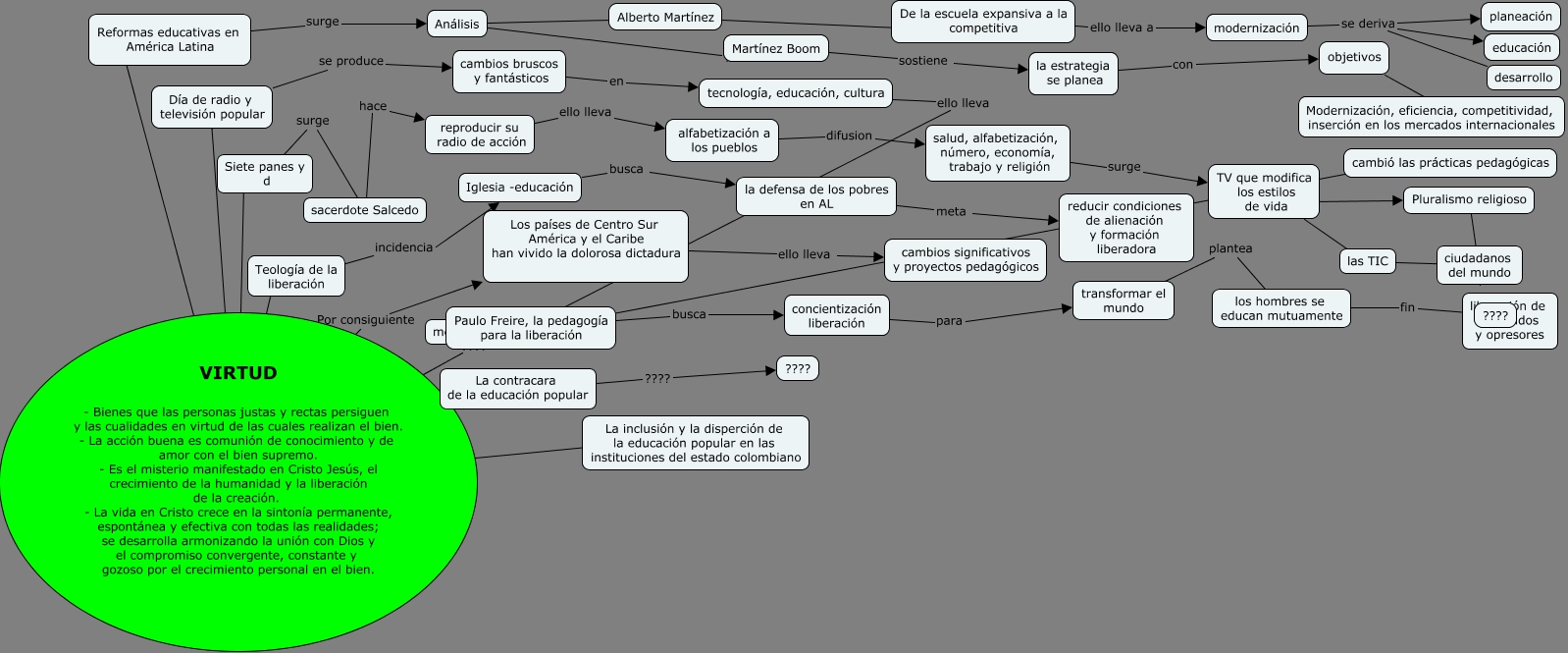 This Concept Map, created with IHMC CmapTools, has information related to: Virtud, cambios bruscos y fantásticos en tecnología, educación, cultura, Pluralismo religioso ???? ciudadanos del mundo, VIRTUD - Bienes que las personas justas y rectas persiguen y las cualidades en virtud de las cuales realizan el bien. - La acción buena es comunión de conocimiento y de amor con el bien supremo. - Es el misterio manifestado en Cristo Jesús, el crecimiento de la humanidad y la liberación de la creación. - La vida en Cristo crece en la sintonía permanente, espontánea y efectiva con todas las realidades; se desarrolla armonizando la unión con Dios y el compromiso convergente, constante y gozoso por el crecimiento personal en el bien. ???? Siete panes y d, VIRTUD - Bienes que las personas justas y rectas persiguen y las cualidades en virtud de las cuales realizan el bien. - La acción buena es comunión de conocimiento y de amor con el bien supremo. - Es el misterio manifestado en Cristo Jesús, el crecimiento de la humanidad y la liberación de la creación. - La vida en Cristo crece en la sintonía permanente, espontánea y efectiva con todas las realidades; se desarrolla armonizando la unión con Dios y el compromiso convergente, constante y gozoso por el crecimiento personal en el bien. ???? Reformas educativas en América Latina, alfabetización a los pueblos difusion salud, alfabetización, número, economía, trabajo y religión, VIRTUD - Bienes que las personas justas y rectas persiguen y las cualidades en virtud de las cuales realizan el bien. - La acción buena es comunión de conocimiento y de amor con el bien supremo. - Es el misterio manifestado en Cristo Jesús, el crecimiento de la humanidad y la liberación de la creación. - La vida en Cristo crece en la sintonía permanente, espontánea y efectiva con todas las realidades; se desarrolla armonizando la unión con Dios y el compromiso convergente, constante y gozoso por el crecimiento personal en el bien. Por consiguiente Los países de Centro Sur América y el Caribe han vivido la dolorosa dictadura, TV que modifica los estilos de vida ???? Pluralismo religioso, modernización se deriva educación, Día de radio y televisión popular ???? VIRTUD - Bienes que las personas justas y rectas persiguen y las cualidades en virtud de las cuales realizan el bien. - La acción buena es comunión de conocimiento y de amor con el bien supremo. - Es el misterio manifestado en Cristo Jesús, el crecimiento de la humanidad y la liberación de la creación. - La vida en Cristo crece en la sintonía permanente, espontánea y efectiva con todas las realidades; se desarrolla armonizando la unión con Dios y el compromiso convergente, constante y gozoso por el crecimiento personal en el bien., Paulo Freire, la pedagogía para la liberación busca concientización liberación, la estrategia se planea con objetivos, VIRTUD - Bienes que las personas justas y rectas persiguen y las cualidades en virtud de las cuales realizan el bien. - La acción buena es comunión de conocimiento y de amor con el bien supremo. - Es el misterio manifestado en Cristo Jesús, el crecimiento de la humanidad y la liberación de la creación. - La vida en Cristo crece en la sintonía permanente, espontánea y efectiva con todas las realidades; se desarrolla armonizando la unión con Dios y el compromiso convergente, constante y gozoso por el crecimiento personal en el bien. ???? La contracara de la educación popular, Siete panes y d surge sacerdote Salcedo, Alberto Martínez ???? De la escuela expansiva a la competitiva, VIRTUD - Bienes que las personas justas y rectas persiguen y las cualidades en virtud de las cuales realizan el bien. - La acción buena es comunión de conocimiento y de amor con el bien supremo. - Es el misterio manifestado en Cristo Jesús, el crecimiento de la humanidad y la liberación de la creación. - La vida en Cristo crece en la sintonía permanente, espontánea y efectiva con todas las realidades; se desarrolla armonizando la unión con Dios y el compromiso convergente, constante y gozoso por el crecimiento personal en el bien. ???? La inclusión y la disperción de la educación popular en las instituciones del estado colombiano, modernización se deriva desarrollo, Martínez Boom sostiene la estrategia se planea, tecnología, educación, cultura ello lleva modificar los estilos de vida, Iglesia -educación busca la defensa de los pobres en AL, La contracara de la educación popular ???? ????