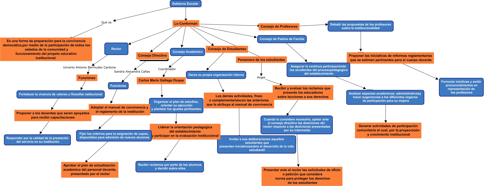 Este Cmap, tiene información relacionada con: a1, Asegurar la continua participaciónde los acudientes del procesopedagogico del establecimiento ???? Analizar aspectos academicos, administrativosy hacer sugerencias a los diferentes organos de particpación para su mejora, Lo Conforman ???? Consejo de Estudiantes, Organizar el plan de estudios, orientar su ejecución y plantear los ajustes pertinentes ???? Liderar la orientación pedagogica del establecimiento y participar en la evaluación institucioinal, Liderar la orientación pedagogica del establecimiento y participar en la evaluación institucioinal ???? Recibir reclamos por parte de los alumnos y decidir sobre ellos, Rector Unverto Antonio Bermudez Cardona Funciones, Carlos Mario Gallego Duque ???? Organizar el plan de estudios, orientar su ejecución y plantear los ajustes pertinentes, Darse su propia organización interna ???? Las demás actividades, fines o complementariascon las anteriores que la atribuya al manual de convivencia, Analizar aspectos academicos, administrativosy hacer sugerencias a los diferentes organos de particpación para su mejora ???? Generar actividades de participación comunitaria el cual, por la proyeccioón y crecimiento institucional, Adoptar el manual de convivencia y el reglamento de la institución ???? Fijar los criterios para la asignación de cupos, disponibles para admisión de nuevos alumnos, Consejo de Padres de Familia ???? Asegurar la continua participaciónde los acudientes del procesopedagogico del establecimiento, Fortalecer la vivencia de valores y filosofiai nstitucional Para tener Proponer a los docentes que seran apoyados para recibir capacitaciones, Cuando lo considere necesario, apelar ante el consejo directivo las desiciones del rector respecto a las desiciones presentadas por su intermedio ???? Presentar ante el rector las solicitudes de oficio o petición que considere norma para proteger los derechos de los estudiantes, Personero de los estudiantes Angie Recibir y evaluar los reclamos que presente los educadores sobre lecciones a sus derechos, Consejo Directivo Sandra Alexandra Cañas Funciones, Fortalecer la vivencia de valores y filosofiai nstitucional Para tener Proponer a los docentes que seran apoyados para recibir capacitaciones, Gobierno Escolar Lo conforman: Rector, Consejo de Profesores ???? Debatir las propuestas de los profesores sobre la institucionalidad, Recibir y evaluar los reclamos que presente los educadores sobre lecciones a sus derechos ???? Cuando lo considere necesario, apelar ante el consejo directivo las desiciones del rector respecto a las desiciones presentadas por su intermedio, Proponer las iniciativas de reformas reglamentarias que se estimen pertinentes para el cuerpo docente ???? Formular inicitivas y emitir pronunciamientos en representación de los profesores, Consejo de Estudiantes ???? Darse su propia organización interna