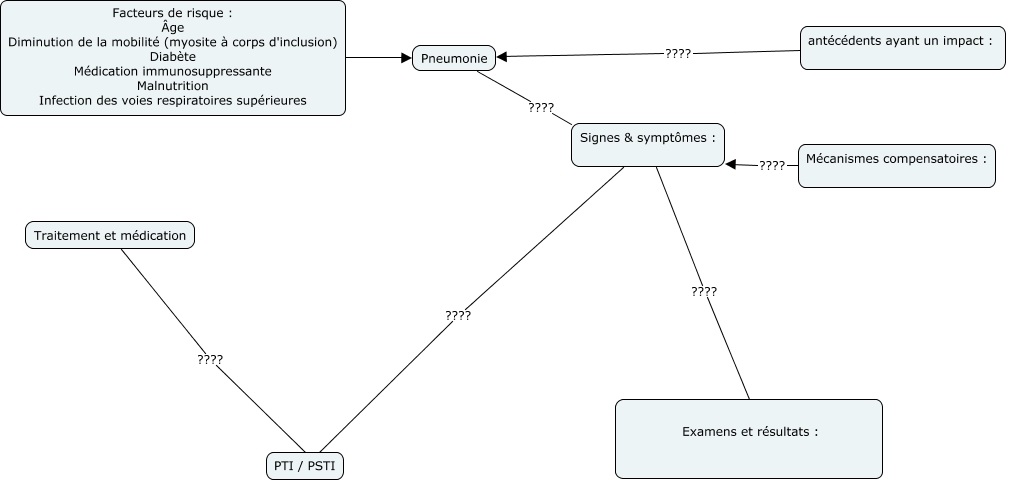 Cette carte de concepts créée avec IHMC CmapTools traite de: SCHÉMA STAGE INTEG AURÉLIE, antécédents ayant un impact : ???? Pneumonie, Facteurs de risque : Âge Diminution de la mobilité (myosite à corps d'inclusion) Diabète Médication immunosuppressante Malnutrition Infection des voies respiratoires supérieures ???? Pneumonie, Signes & symptômes : ???? Examens et résultats :, Mécanismes compensatoires : ???? Signes & symptômes :, Pneumonie ???? Signes & symptômes :, Traitement et médication ???? PTI / PSTI, Signes & symptômes : ???? PTI / PSTI
