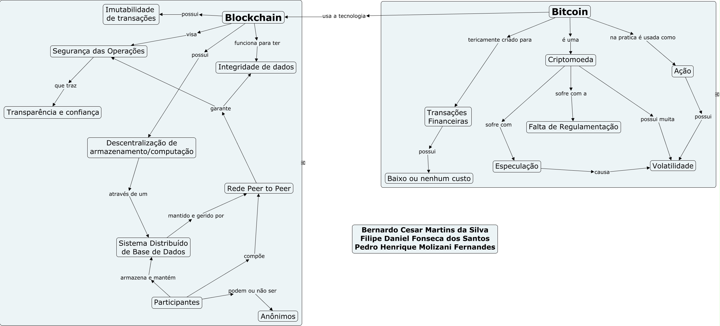 Esse mapa conceitual, produzido no IHMC CmapTools, tem a informação relacionada a: BITCOIN.cmap, Participantes podem ou não ser Anônimos, Blockchain funciona para ter Integridade de dados, Transações Financeiras possui Baixo ou nenhum custo, Rede Peer to Peer garante Integridade de dados, Blockchain visa Segurança das Operações, Sistema Distribuído de Base de Dados mantido e gerido por Rede Peer to Peer, Descentralização de armazenamento/computação através de um Sistema Distribuído de Base de Dados, Bitcoin é uma Criptomoeda, Ação possui Volatilidade, Participantes armazena e mantém Sistema Distribuído de Base de Dados, Criptomoeda sofre com Especulação, Criptomoeda sofre com a Falta de Regulamentação, Bitcoin na pratica é usada como Ação, Bitcoin usa a tecnologia Blockchain, Participantes compõe Rede Peer to Peer, Blockchain possui Imutabilidade de transações, Rede Peer to Peer garante Segurança das Operações, Segurança das Operações que traz Transparência e confiança, Blockchain possui Descentralização de armazenamento/computação, Criptomoeda possui muita Volatilidade