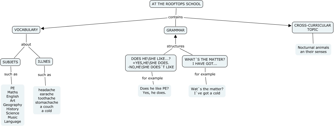 Este Cmap, tiene información relacionada con: AT THE ROOFTOPS SCHOOL`-María J y Sofía, AT THE ROOFTOPS SCHOOL contains GRAMMAR, Nocturnal animals an their senses ???? CROSS-CURRICULAR TOPIC, DOES HE\SHE LIKE...? +YES,HE\SHE DOES. -NO,HE\SHE DOES`T LIKE structures WHAT´S THE MATTER? I HAVE GOT..., DOES HE\SHE LIKE...? +YES,HE\SHE DOES. -NO,HE\SHE DOES`T LIKE structures GRAMMAR, ILLNES such as headache earache toothache stomachache a couch a cold, WHAT´S THE MATTER? I HAVE GOT... for example Wat`s the matter? I`ve got a cold, AT THE ROOFTOPS SCHOOL contains GRAMMAR, VOCABULARY about ILLNES, AT THE ROOFTOPS SCHOOL contains CROSS-CURRICULAR TOPIC, VOCABULARY about SUBJETS, DOES HE\SHE LIKE...? +YES,HE\SHE DOES. -NO,HE\SHE DOES`T LIKE for example Does he like PE? Yes, he does., AT THE ROOFTOPS SCHOOL contains VOCABULARY, SUBJETS such as PE Maths English Art Geography History Science Music Language