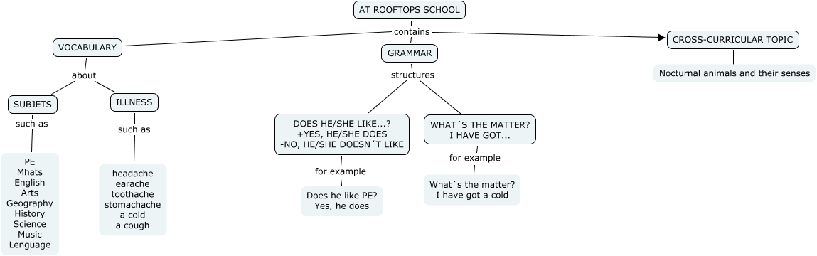 Este Cmap, tiene información relacionada con: AT ROOFTOPS SCHOOL Iria y Carmen B, CROSS-CURRICULAR TOPIC Nocturnal animals and their senses, VOCABULARY about SUBJETS, AT ROOFTOPS SCHOOL contains GRAMMAR, GRAMMAR structures DOES HE/SHE LIKE...? +YES, HE/SHE DOES -NO, HE/SHE DOESN´T LIKE, ILLNESS such as headache earache toothache stomachache a cold a cough, SUBJETS such as PE Mhats English Arts Geography History Science Music Lenguage, GRAMMAR structures WHAT´S THE MATTER? I HAVE GOT..., VOCABULARY contains GRAMMAR, WHAT´S THE MATTER? I HAVE GOT... for example What´s the matter? I have got a cold, DOES HE/SHE LIKE...? +YES, HE/SHE DOES -NO, HE/SHE DOESN´T LIKE for example Does he like PE? Yes, he does, VOCABULARY about ILLNESS, VOCABULARY contains CROSS-CURRICULAR TOPIC, AT ROOFTOPS SCHOOL contains CROSS-CURRICULAR TOPIC