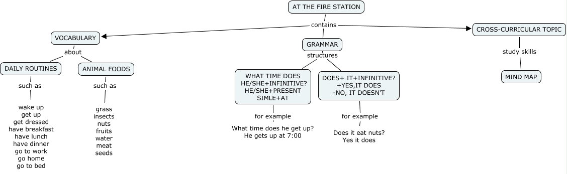 Este Cmap, tiene información relacionada con: AT THE FIRE STATION María M y Arantxa, GRAMMAR structures WHAT TIME DOES HE/SHE+INFINITIVE? HE/SHE+PRESENT SIMLE+AT, AT THE FIRE STATION contains GRAMMAR, VOCABULARY about ANIMAL FOODS, DAILY ROUTINES such as wake up get up get dressed have breakfast have lunch have dinner go to work go home go to bed, AT THE FIRE STATION contains VOCABULARY, DOES+ IT+INFINITIVE? +YES,IT DOES -NO, IT DOESN'T for example Does it eat nuts? Yes it does, GRAMMAR structures DOES+ IT+INFINITIVE? +YES,IT DOES -NO, IT DOESN'T, WHAT TIME DOES HE/SHE+INFINITIVE? HE/SHE+PRESENT SIMLE+AT for example What time does he get up? He gets up at 7:00, ANIMAL FOODS such as grass insects nuts fruits water meat seeds, AT THE FIRE STATION contains CROSS-CURRICULAR TOPIC, VOCABULARY about DAILY ROUTINES, CROSS-CURRICULAR TOPIC study skills MIND MAP
