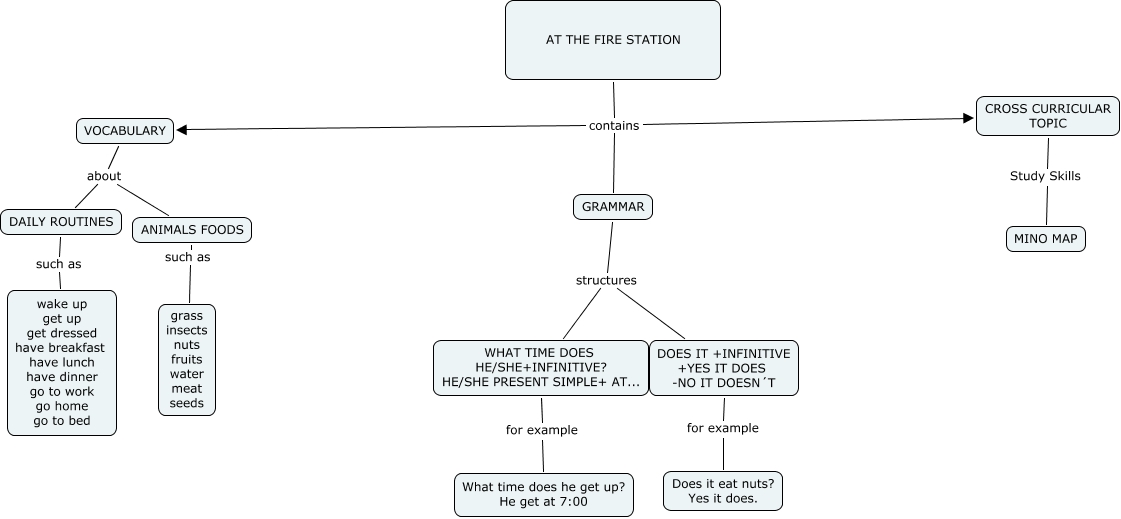 Este Cmap, tiene información relacionada con: at the fire station lucas y carmen, AT THE FIRE STATION contains CROSS CURRICULAR TOPIC, WHAT TIME DOES HE/SHE+INFINITIVE? HE/SHE PRESENT SIMPLE+ AT... for example What time does he get up? He get at 7:00, DOES IT +INFINITIVE +YES IT DOES -NO IT DOESN´T for example Does it eat nuts? Yes it does., AT THE FIRE STATION contains GRAMMAR, VOCABULARY about ANIMALS FOODS, GRAMMAR structures DOES IT +INFINITIVE +YES IT DOES -NO IT DOESN´T, AT THE FIRE STATION contains VOCABULARY, DAILY ROUTINES such as wake up get up get dressed have breakfast have lunch have dinner go to work go home go to bed, CROSS CURRICULAR TOPIC Study Skills MINO MAP, VOCABULARY about DAILY ROUTINES, ANIMALS FOODS such as grass insects nuts fruits water meat seeds, GRAMMAR structures WHAT TIME DOES HE/SHE+INFINITIVE? HE/SHE PRESENT SIMPLE+ AT...
