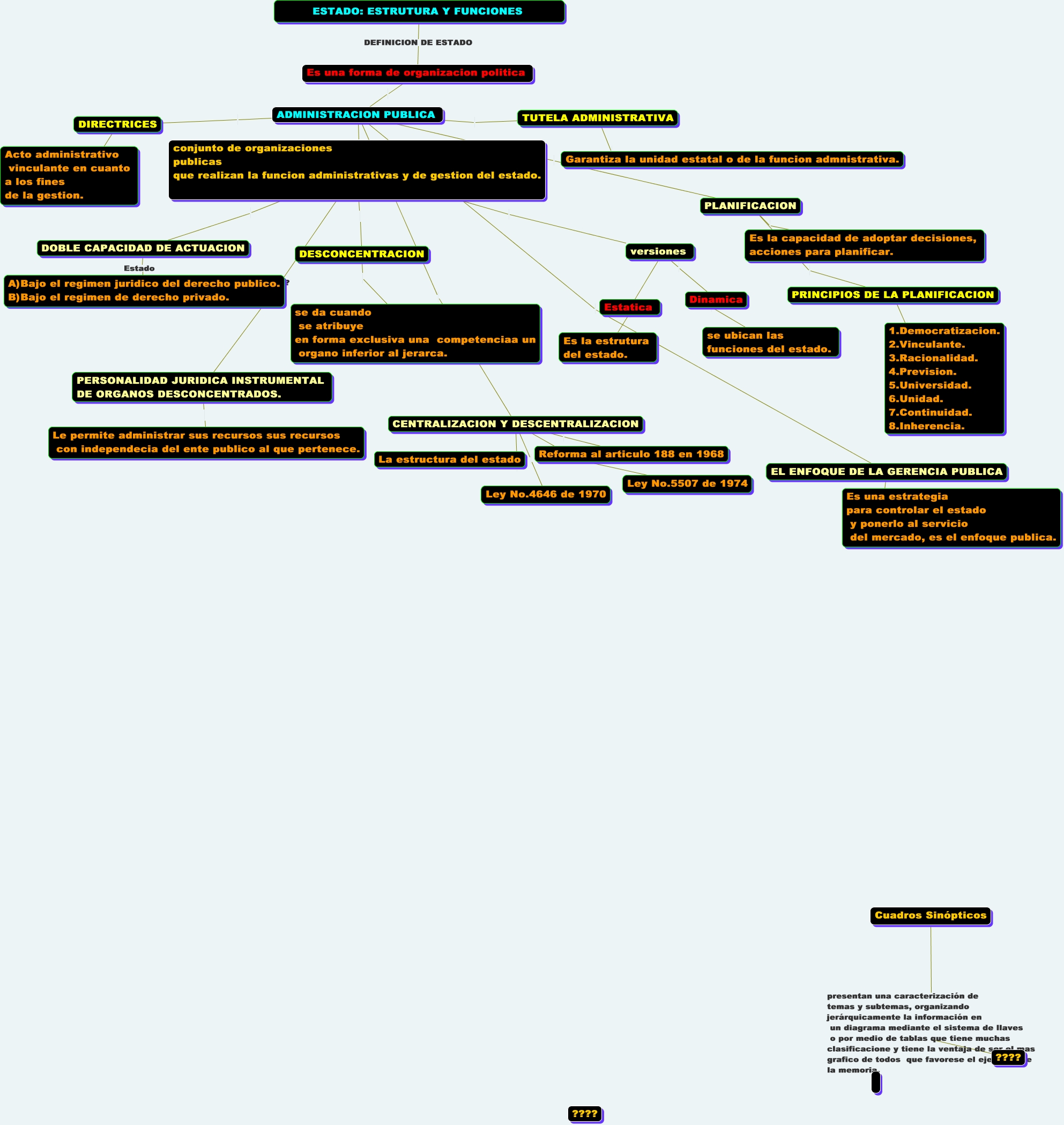 Este Cmap, tiene información relacionada con: esquma pa, ADMINISTRACION PUBLICA PLANIFICACION, ADMINISTRACION PUBLICA DIRECTRICES, DIRECTRICES Acto administrativo vinculante en cuanto a los fines de la gestion., ADMINISTRACION PUBLICA CENTRALIZACION Y DESCENTRALIZACION, Es una forma de organizacion politica ADMINISTRACION PUBLICA, PERSONALIDAD JURIDICA INSTRUMENTAL DE ORGANOS DESCONCENTRADOS. Le permite administrar sus recursos sus recursos con independecia del ente publico al que pertenece., EL ENFOQUE DE LA GERENCIA PUBLICA Es una estrategia para controlar el estado y ponerlo al servicio del mercado, es el enfoque publica., CENTRALIZACION Y DESCENTRALIZACION Ley No.4646 de 1970, Cuadros Sinópticos presentan una caracterización de temas y subtemas, organizando jerárquicamente la información en un diagrama mediante el sistema de llaves o por medio de tablas que tiene muchas clasificacione y tiene la ventaja de ser el mas grafico de todos que favorese el ejercicio de la memoria. ????, CENTRALIZACION Y DESCENTRALIZACION Reforma al articulo 188 en 1968, versiones Estatica, Estatica Es la estrutura del estado., PLANIFICACION PRINCIPIOS DE LA PLANIFICACION, PLANIFICACION Es la capacidad de adoptar decisiones, acciones para planificar., DOBLE CAPACIDAD DE ACTUACION Estado A)Bajo el regimen juridico del derecho publico. B)Bajo el regimen de derecho privado., CENTRALIZACION Y DESCENTRALIZACION La estructura del estado, conjunto de organizaciones publicas que realizan la funcion administrativas y de gestion del estado. ???? PERSONALIDAD JURIDICA INSTRUMENTAL DE ORGANOS DESCONCENTRADOS., ADMINISTRACION PUBLICA conjunto de organizaciones publicas que realizan la funcion administrativas y de gestion del estado., DESCONCENTRACION se da cuando se atribuye en forma exclusiva una competenciaa un organo inferior al jerarca., conjunto de organizaciones publicas que realizan la funcion administrativas y de gestion del estado. versiones