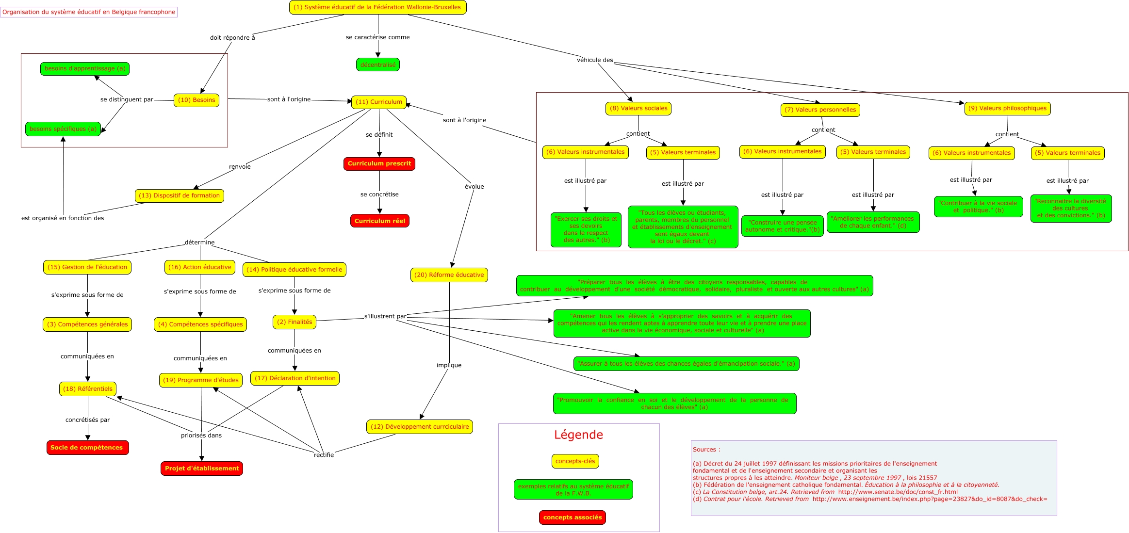 Cette carte de concepts créée avec IHMC CmapTools traite de: CC_TP1_C13, (11) Curriculum détermine (16) Action éducative, (14) Politique éducative formelle s'exprime sous forme de (2) Finalités, (1) Système éducatif de la Fédération Wallonie-Bruxelles doit répondre à (10) Besoins, (2) Finalités s'illustrent par "Assurer à tous les élèves des chances égales d'émancipation sociale." (a), (3) Compétences générales communiquées en (18) Référentiels, (5) Valeurs terminales est illustré par "Tous les élèves ou étudiants, parents, membres du personnel et établissements d'enseignement sont égaux devant la loi ou le décret." (c), (1) Système éducatif de la Fédération Wallonie-Bruxelles véhicule des (8) Valeurs sociales, (6) Valeurs instrumentales est illustré par "Contribuer à la vie sociale et politique." (b), (2) Finalités s'illustrent par "Amener tous les élèves à s'approprier des savoirs et à acquérir des compétences qui les rendent aptes à apprendre toute leur vie et à prendre une place active dans la vie économique, sociale et culturelle" (a), sont à l'origine, (11) Curriculum détermine (14) Politique éducative formelle, (2) Finalités communiquées en (17) Déclaration d'intention, (12) Développement currciculaire rectifie (17) Déclaration d'intention, (8) Valeurs sociales contient (6) Valeurs instrumentales, (2) Finalités s'illustrent par "Préparer tous les élèves à être des citoyens responsables, capables de contribuer au développement d'une société démocratique, solidaire, pluraliste et ouverte aux autres cultures" (a), (1) Système éducatif de la Fédération Wallonie-Bruxelles véhicule des (7) Valeurs personnelles, (10) Besoins se distinguent par besoins d'apprentissage (a), (18) Référentiels concrétisés par Socle de compétences, sont à l'origine, (7) Valeurs personnelles contient (5) Valeurs terminales