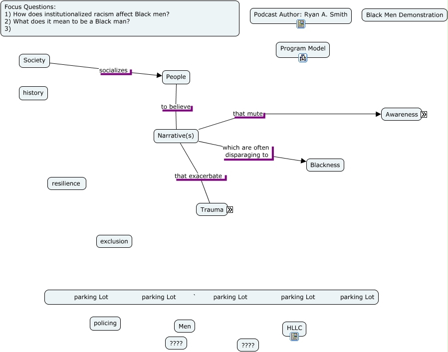 This Concept Map, created with IHMC CmapTools, has information related to: Black Men Demonstration- RU Newark, Narrative(s) that mute Awareness, Narrative(s) that exacerbate Trauma, Society socializes People, Narrative(s) which are often disparaging to Blackness, People to believe Narrative(s)