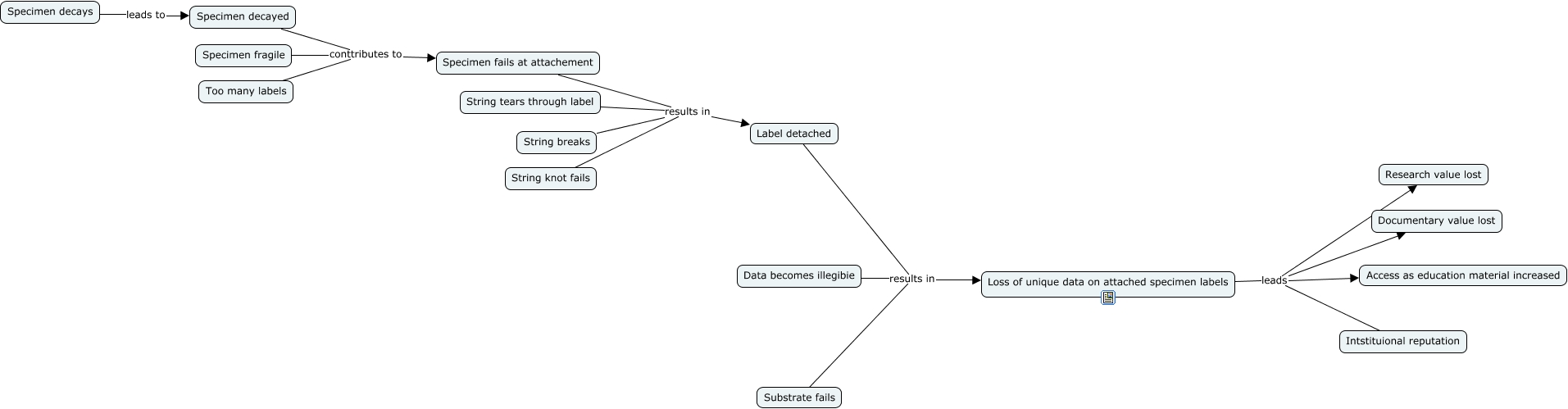 This Concept Map, created with IHMC CmapTools, has information related to: Loss of unique data fr9om specimen labels, Label detached results in Loss of unique data on attached specimen labels, Data becomes illegibie results in Loss of unique data on attached specimen labels, String tears through label results in Label detached, Substrate fails results in Loss of unique data on attached specimen labels, String knot fails results in Label detached, Loss of unique data on attached specimen labels leads Intstituional reputation, Loss of unique data on attached specimen labels leads Access as education material increased, Specimen decays leads to Specimen decayed, Specimen fragile conttributes to Specimen fails at attachement, Specimen fails at attachement results in Label detached, Loss of unique data on attached specimen labels leads Research value lost, String breaks results in Label detached, Loss of unique data on attached specimen labels leads Documentary value lost, Specimen decayed conttributes to Specimen fails at attachement, Too many labels conttributes to Specimen fails at attachement