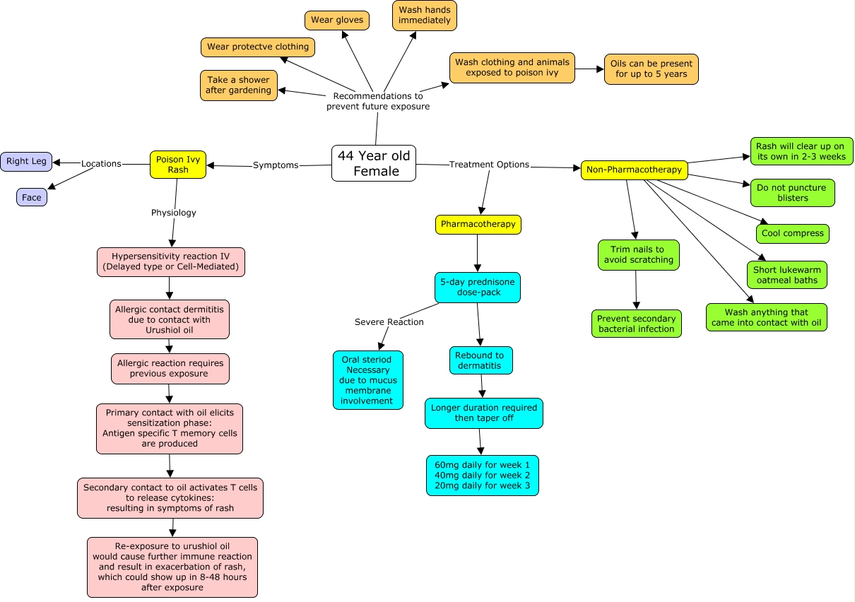 This Concept Map, created with IHMC CmapTools, has information related to: Poison Ivy, Non-Pharmacotherapy ???? Do not puncture blisters, 5-day prednisone dose-pack ???? Rebound to dermatitis, Allergic contact dermititis due to contact with Urushiol oil ???? Allergic reaction requires previous exposure, Secondary contact to oil activates T cells to release cytokines: resulting in symptoms of rash ???? Re-exposure to urushiol oil would cause further immune reaction and result in exacerbation of rash, which could show up in 8-48 hours after exposure, 44 Year old Female Treatment Options Pharmacotherapy, Poison Ivy Rash Locations Right Leg, Non-Pharmacotherapy ???? Rash will clear up on its own in 2-3 weeks, 44 Year old Female Recommendations to prevent future exposure Take a shower after gardening, 44 Year old Female Recommendations to prevent future exposure Wear gloves, 44 Year old Female Symptoms Poison Ivy Rash, Wash clothing and animals exposed to poison ivy ???? Oils can be present for up to 5 years, 5-day prednisone dose-pack Severe Reaction Oral steriod Necessary due to mucus membrane involvement, Allergic reaction requires previous exposure ???? Primary contact with oil elicits sensitization phase: Antigen specific T memory cells are produced, 44 Year old Female Recommendations to prevent future exposure Wash clothing and animals exposed to poison ivy, Poison Ivy Rash Physiology Hypersensitivity reaction IV (Delayed type or Cell-Mediated), Non-Pharmacotherapy ???? Short lukewarm oatmeal baths, 44 Year old Female Recommendations to prevent future exposure Wear protectve clothing, Longer duration required then taper off ???? 60mg daily for week 1 40mg daily for week 2 20mg daily for week 3, Pharmacotherapy ???? 5-day prednisone dose-pack, Hypersensitivity reaction IV (Delayed type or Cell-Mediated) ???? Allergic contact dermititis due to contact with Urushiol oil