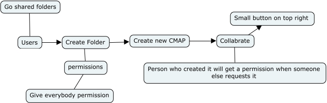 This Concept Map, created with IHMC CmapTools, has information related to: How to Share CMAP, Collabrate ???? Person who created it will get a permission when someone else requests it, Create Folder ???? Create new CMAP, Create new CMAP ???? Collabrate, permissions ???? Give everybody permission, Create Folder ???? permissions, Users ???? Create Folder, Collabrate ???? Small button on top right, Go shared folders ???? Users