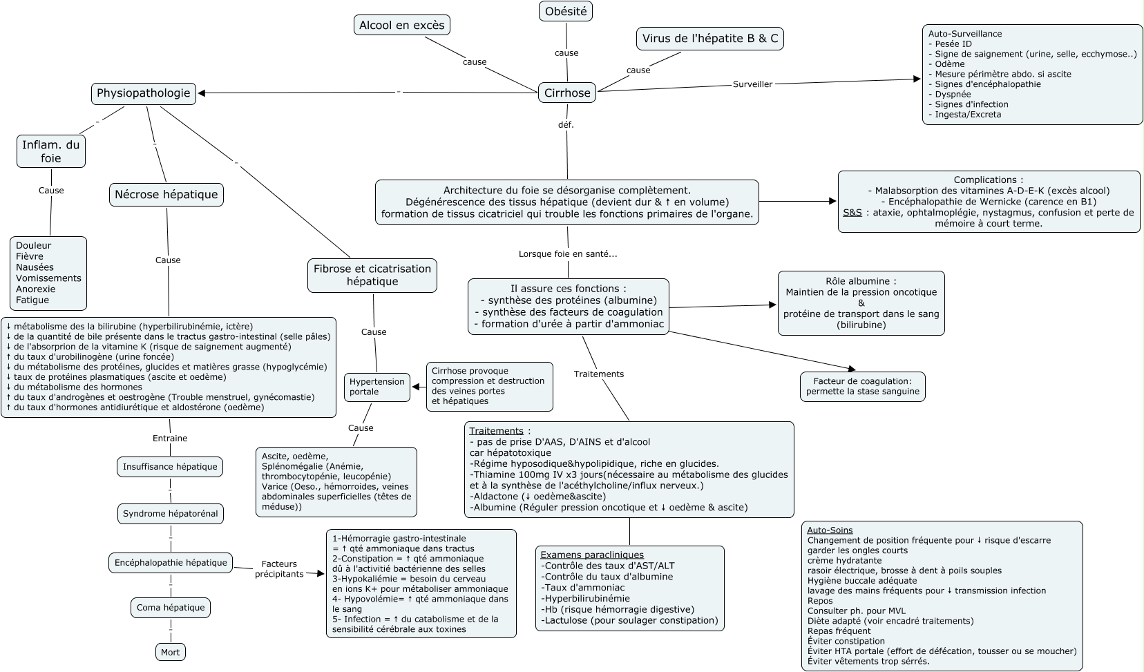 Cette carte de concepts créée avec IHMC CmapTools traite de: Cirrhose, Traitements : - pas de prise D'AAS, D'AINS et d'alcool car hépatotoxique -Régime hyposodique&hypolipidique, riche en glucides. -Thiamine 100mg IV x3 jours(nécessaire au métabolisme des glucides et à la synthèse de l'acéthylcholine/influx nerveux.) -Aldactone (↓ oedème&ascite) -Albumine (Réguler pression oncotique et ↓ oedème & ascite) ???? Examens paracliniques -Contrôle des taux d'AST/ALT -Contrôle du taux d'albumine -Taux d'ammoniac -Hyperbilirubinémie -Hb (risque hémorragie digestive) -Lactulose (pour soulager constipation), Cirrhose déf. Architecture du foie se désorganise complètement. Dégénérescence des tissus hépatique (devient dur & ↑ en volume) formation de tissus cicatriciel qui trouble les fonctions primaires de l'organe., Cirrhose . Physiopathologie, Obésité cause Cirrhose, Fibrose et cicatrisation hépatique Cause Hypertension portale, Il assure ces fonctions : - synthèse des protéines (albumine) - synthèse des facteurs de coagulation - formation d'urée à partir d'ammoniac Traitements Traitements : - pas de prise D'AAS, D'AINS et d'alcool car hépatotoxique -Régime hyposodique&hypolipidique, riche en glucides. -Thiamine 100mg IV x3 jours(nécessaire au métabolisme des glucides et à la synthèse de l'acéthylcholine/influx nerveux.) -Aldactone (↓ oedème&ascite) -Albumine (Réguler pression oncotique et ↓ oedème & ascite), Virus de l'hépatite B & C cause Cirrhose, Insuffisance hépatique . Syndrome hépatorénal, Alcool en excès cause Cirrhose, Nécrose hépatique Cause ↓ métabolisme des la bilirubine (hyperbilirubinémie, ictère) ↓ de la quantité de bile présente dans le tractus gastro-intestinal (selle pâles) ↓ de l'absorprion de la vitamine K (risque de saignement augmenté) ↑ du taux d'urobilinogène (urine foncée) ↓ du métabolisme des protéines, glucides et matières grasse (hypoglycémie) ↓ taux de protéines plasmatiques (ascite et oedème) ↓ du métabolisme des hormones ↑ du taux d'androgènes et oestrogène (Trouble menstruel, gynécomastie) ↑ du taux d'hormones antidiurétique et aldostérone (oedème), Encéphalopathie hépatique Facteurs précipitants 1-Hémorragie gastro-intestinale = ↑ qté ammoniaque dans tractus 2-Constipation = ↑ qté ammoniaque dû à l'activitié bactérienne des selles 3-Hypokaliémie = besoin du cerveau en ions K+ pour métaboliser ammoniaque 4- Hypovolémie= ↑ qté ammoniaque dans le sang 5- Infection = ↑ du catabolisme et de la sensibilité cérébrale aux toxines, Coma hépatique . Mort, Syndrome hépatorénal . Encéphalopathie hépatique, Physiopathologie . Inflam. du foie, Il assure ces fonctions : - synthèse des protéines (albumine) - synthèse des facteurs de coagulation - formation d'urée à partir d'ammoniac ???? Rôle albumine : Maintien de la pression oncotique & protéine de transport dans le sang (bilirubine), Hypertension portale Cause Ascite, oedème, Splénomégalie (Anémie, thrombocytopénie, leucopénie) Varice (Oeso., hémorroides, veines abdominales superficielles (têtes de méduse)), Physiopathologie . Fibrose et cicatrisation hépatique, Il assure ces fonctions : - synthèse des protéines (albumine) - synthèse des facteurs de coagulation - formation d'urée à partir d'ammoniac ???? Facteur de coagulation: permette la stase sanguine, Architecture du foie se désorganise complètement. Dégénérescence des tissus hépatique (devient dur & ↑ en volume) formation de tissus cicatriciel qui trouble les fonctions primaires de l'organe. ???? Complications : - Malabsorption des vitamines A-D-E-K (excès alcool) - Encéphalopathie de Wernicke (carence en B1) S&S : ataxie, ophtalmoplégie, nystagmus, confusion et perte de mémoire à court terme., Encéphalopathie hépatique . Coma hépatique