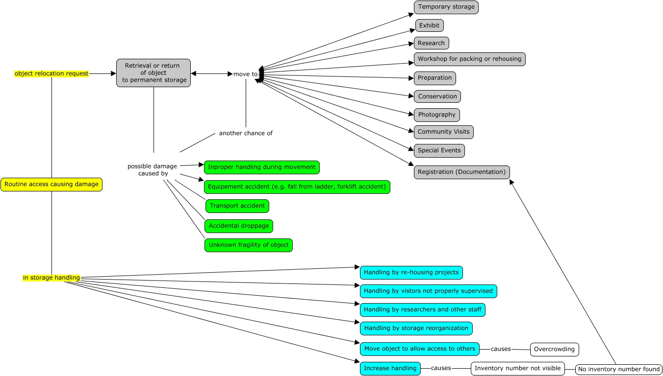 This Concept Map, created with IHMC CmapTools, has information related to: Tinisha - Routine access causing damage, Retrieval or return of object to permanent storage possible damage caused by Equipement accident (e.g. fall from ladder, forklift accident), Retrieval or return of object to permanent storage move to Community Visits, another chance of possible damage caused by Equipement accident (e.g. fall from ladder, forklift accident), Routine access causing damage in storage handling Increase handling, Routine access causing damage in storage handling Handling by re-housing projects, another chance of possible damage caused by Unknown fragility of object, Routine access causing damage object relocation request Retrieval or return of object to permanent storage, Retrieval or return of object to permanent storage move to Conservation, Routine access causing damage in storage handling Handling by researchers and other staff, Retrieval or return of object to permanent storage move to Registration, Retrieval or return of object to permanent storage move to Temporary storage, Retrieval or return of object to permanent storage move to Preparation, Retrieval or return of object to permanent storage possible damage caused by Unknown fragility of object, Retrieval or return of object to permanent storage move to Research, Routine access causing damage in storage handling Move object to allow access to others, another chance of possible damage caused by Transport accident, Inventory number not visible No inventory number found Registration (Documentation), Retrieval or return of object to permanent storage possible damage caused by Transport accident, Retrieval or return of object to permanent storage move to another chance of, Retrieval or return of object to permanent storage move to Workshop for packing or rehousing