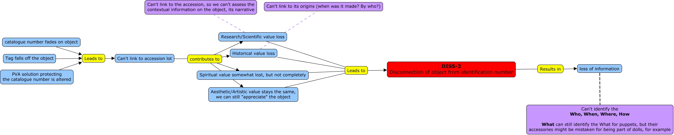 This Concept Map, created with IHMC CmapTools, has information related to: Stef DISS-3 cmap, contributes to Research/Scientific value loss, Research/Scientific value loss Can't link to the accession, so we can't assess the contextual information on the object, its narrative, contributes to Spiritual value somewhat lost, but not completely, Leads to Can't link to accession lot, Aesthetic/Artistic value stays the same, we can still "appreciate" the object Leads to, loss of information Can't identify the Who, When, Where, How What can still identify the What for puppets, but their accessories might be mistaken for being part of dolls, for example, Can't link to accession lot contributes to, Results in loss of information, contributes to Historical value loss, Leads to DISS-3 Disconnection of object from identification number, contributes to Aesthetic/Artistic value stays the same, we can still "appreciate" the object, catalogue number fades on object Leads to, DISS-3 Disconnection of object from identification number Results in, Tag falls off the object Leads to, Research/Scientific value loss Leads to, Historical value loss Can't link to its origins (when was it made? By who?), PVA solution protecting the catalogue number is altered Leads to, Spiritual value somewhat lost, but not completely Leads to, Historical value loss Leads to