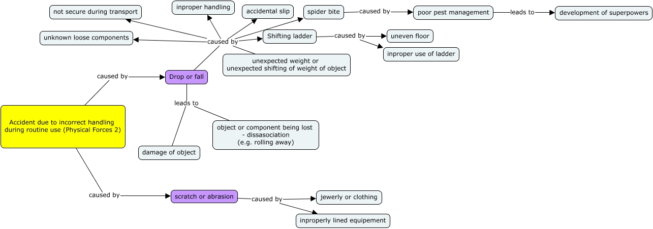 This Concept Map, created with IHMC CmapTools, has information related to: Tinisha Phys F 2 - Handling Accident, Drop or fall leads to damage of object, Drop or fall caused by inproper handling, poor pest management leads to development of superpowers, Drop or fall caused by accidental slip, Drop or fall caused by unknown loose components, Accident due to incorrect handling during routine use (Physical Forces 2) caused by Drop or fall, Drop or fall leads to object or component being lost - dissasociation (e.g. rolling away), Drop or fall caused by unexpected weight or unexpected shifting of weight of object, Shifting ladder caused by uneven floor, Shifting ladder caused by inproper use of ladder, spider bite caused by poor pest management, Drop or fall caused by not secure during transport, Drop or fall caused by spider bite, Drop or fall caused by Shifting ladder, Accident due to incorrect handling during routine use (Physical Forces 2) caused by scratch or abrasion, scratch or abrasion caused by inproperly lined equipement, scratch or abrasion caused by jewerly or clothing