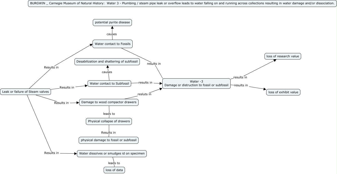 This Concept Map, created with IHMC CmapTools, has information related to: Burgwin M_Loss of specimen value due to Water-3, Leak or failure of Steam valves Results in Damage to wood compactor drawers, Water dissolves or smudges id on specimen leads to loss of data, Leak or failure of Steam valves Results in Water contact to Fossils, Water contact to Fossils results in Water -3 Damage or distruction to fossil or subfossil, Damage to wood compactor drawers resluts in Water -3 Damage or distruction to fossil or subfossil, Leak or failure of Steam valves Results in Water dissolves or smudges id on specimen, Water -3 Damage or distruction to fossil or subfossil results in loss of exhibit value, Physical collapse of drawers Results in physical damage to fossil or subfossil, Water -3 Damage or distruction to fossil or subfossil results in loss of research value, Water contact to Fossils causes potential pyrite disease, Damage to wood compactor drawers leads to Physical collapse of drawers, Leak or failure of Steam valves Results in Water contact to Subfossil, Water contact to Subfossil results in Water -3 Damage or distruction to fossil or subfossil, Water contact to Subfossil causes Desabilization and shattering of subfossil