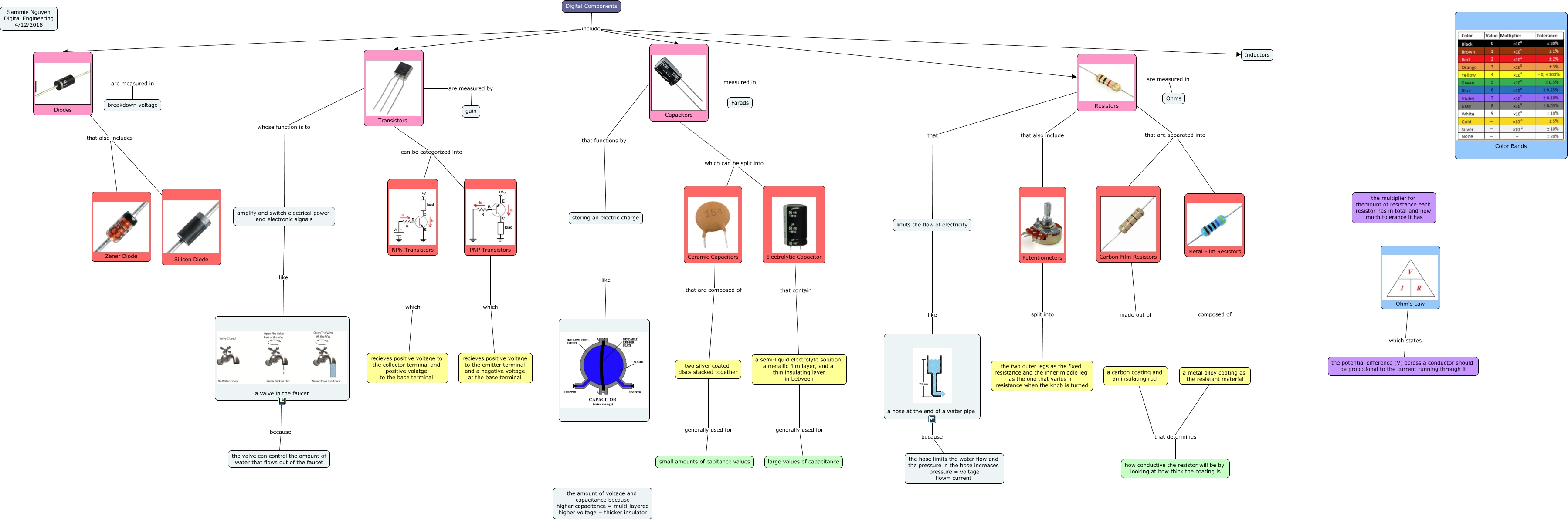 This Concept Map, created with IHMC CmapTools, has information related to: Digital Components, Potentiometers split into the two outer legs as the fixed resistance and the inner middle leg as the one that varies in resistance when the knob is turned, Diodes are measured in breakdown voltage, storing an electric charge like, Digital Components include Transistors, Resistors are measured in Ohms, Resistors that also include Potentiometers, Capacitors measured in Farads, Resistors that are separated into Carbon Film Resistors, Transistors whose function is to amplify and switch electrical power and electronic signals, Capacitors which can be split into Ceramic Capacitors, NPN Transistors which recieves positive voltage to the collector terminal and positive volatge to the base terminal, limits the flow of electricity like a hose at the end of a water pipe, Metal Film Resistors composed of a metal alloy coating as the resistant material, a metal alloy coating as the resistant material that determines how conductive the resistor will be by looking at how thick the coating is, a carbon coating and an insulating rod that determines how conductive the resistor will be by looking at how thick the coating is, Digital Components include Diodes, amplify and switch electrical power and electronic signals like a valve in the faucet, Transistors can be categorized into NPN Transistors, Diodes that also includes Silicon Diode, Digital Components include Resistors