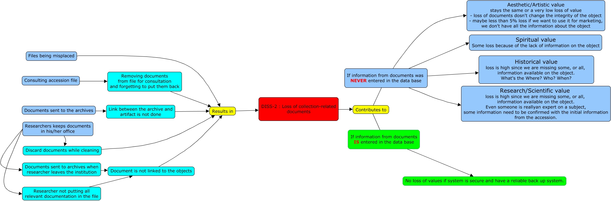 This Concept Map, created with IHMC CmapTools, has information related to: Stef DISS-2 cmap, Removing documents from file for consultation and forgetting to put them back Results in, Researchers keeps documents in his/her office Discard documents while cleaning, If information from documents was NEVER entered in the data base Aesthetic/Artistic value stays the same or a very low loss of value - loss of documents dosn't change the integrity of the object - maybe less than 5% loss if we want to use it for marketing, we don't have all the information about the object, Contributes to If information from documents was NEVER entered in the data base, Documents sent to the archives Link between the archive and artifact is not done, Researchers keeps documents in his/her office Researcher not putting all relevant documentation in the file, If information from documents was NEVER entered in the data base Research/Scientific value loss is high since we are missing some, or all, information available on the object. Even someone is reallyan expert on a subject, some information need to be confirmed with the initial information from the accession., Discard documents while cleaning Results in, Researchers keeps documents in his/her office Documents sent to archives when researcher leaves the institution, Link between the archive and artifact is not done Results in, If information from documents was NEVER entered in the data base Historical value loss is high since we are missing some, or all, information available on the object. What's the Where? Who? When?, Consulting accession file Removing documents from file for consultation and forgetting to put them back, If information from documents was NEVER entered in the data base Spiritual value Some loss because of the lack of information on the object, If information from documents IS entered in the data base No loss of values if system is secure and have a reliable back up system., Document is not linked to the objects Results in, Documents sent to archives when researcher leaves the institution Document is not linked to the objects, DISS-2 : Loss of collection-related documents Contributes to, Files being misplaced Results in, Researcher not putting all relevant documentation in the file Document is not linked to the objects, Results in DISS-2 : Loss of collection-related documents