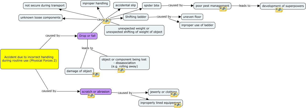 This Concept Map, created with IHMC CmapTools, has information related to: Tinisha Phys F 2 - Handling Accident - RW suggestions, Drop or fall leads to damage of object, Drop or fall caused by inproper handling, poor pest management leads to development of superpowers, Drop or fall caused by accidental slip, Drop or fall caused by unknown loose components, Accident due to incorrect handling during routine use (Physical Forces 2) caused by Drop or fall, Drop or fall leads to object or component being lost - dissasociation (e.g. rolling away), Drop or fall caused by unexpected weight or unexpected shifting of weight of object, Shifting ladder caused by uneven floor, Shifting ladder caused by inproper use of ladder, spider bite caused by poor pest management, Drop or fall caused by not secure during transport, Drop or fall caused by spider bite, Drop or fall caused by Shifting ladder, Accident due to incorrect handling during routine use (Physical Forces 2) caused by scratch or abrasion, scratch or abrasion caused by inproperly lined equipement, scratch or abrasion caused by jewerly or clothing