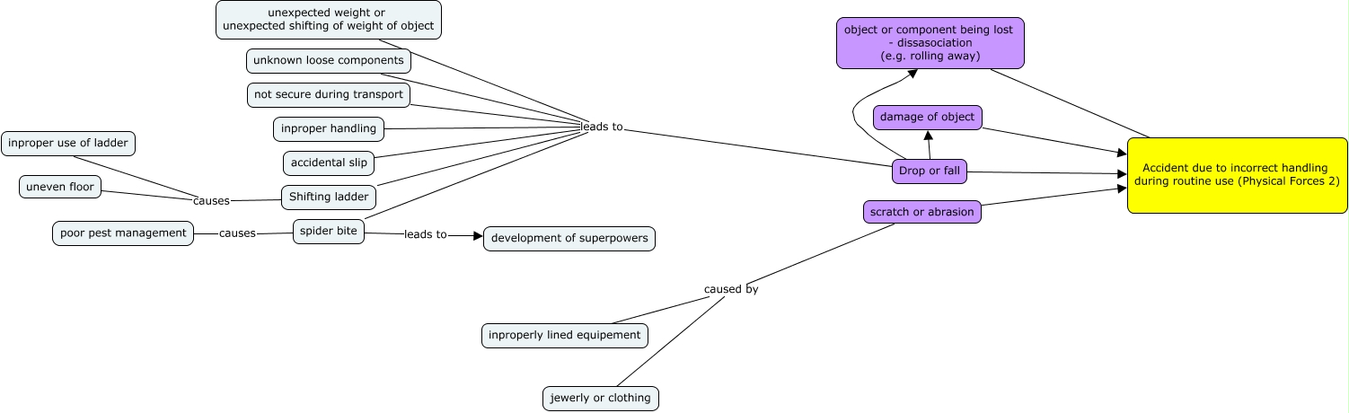 This Concept Map, created with IHMC CmapTools, has information related to: Tinisha Phys F 2 - Handling Accident - attempt 2, Drop or fall Accident due to incorrect handling during routine use (Physical Forces 2), scratch or abrasion Accident due to incorrect handling during routine use (Physical Forces 2), spider bite leads to development of superpowers, damage of object Accident due to incorrect handling during routine use (Physical Forces 2), Drop or fall object or component being lost - dissasociation (e.g. rolling away), object or component being lost - dissasociation (e.g. rolling away) Accident due to incorrect handling during routine use (Physical Forces 2), Drop or fall damage of object