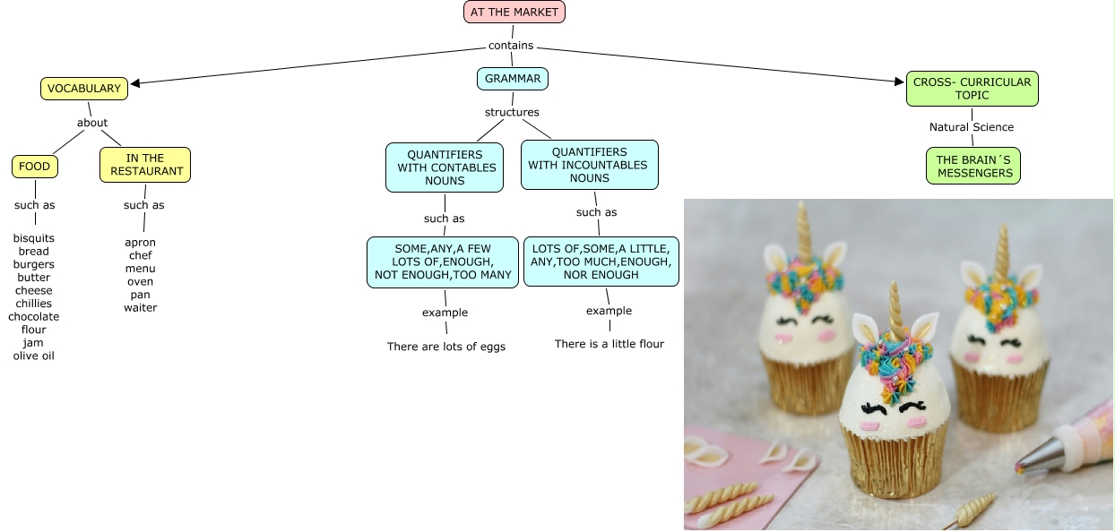 Este Cmap, tiene información relacionada con: AT THE MARKET-Sofia y Yago, FOOD such as bisquits bread burgers butter cheese chillies chocolate flour jam olive oil, VOCABULARY about IN THE RESTAURANT, GRAMMAR structures QUANTIFIERS WITH INCOUNTABLES NOUNS, QUANTIFIERS WITH INCOUNTABLES NOUNS such as LOTS OF,SOME,A LITTLE, ANY,TOO MUCH,ENOUGH, NOR ENOUGH, IN THE RESTAURANT such as apron chef menu oven pan waiter, AT THE MARKET contains VOCABULARY, VOCABULARY about FOOD, AT THE MARKET contains CROSS- CURRICULAR TOPIC, AT THE MARKET contains GRAMMAR, SOME,ANY,A FEW LOTS OF,ENOUGH, NOT ENOUGH,TOO MANY example There are lots of eggs, QUANTIFIERS WITH CONTABLES NOUNS such as SOME,ANY,A FEW LOTS OF,ENOUGH, NOT ENOUGH,TOO MANY, CROSS- CURRICULAR TOPIC Natural Science THE BRAIN´S MESSENGERS, LOTS OF,SOME,A LITTLE, ANY,TOO MUCH,ENOUGH, NOR ENOUGH example There is a little flour, GRAMMAR structures QUANTIFIERS WITH CONTABLES NOUNS