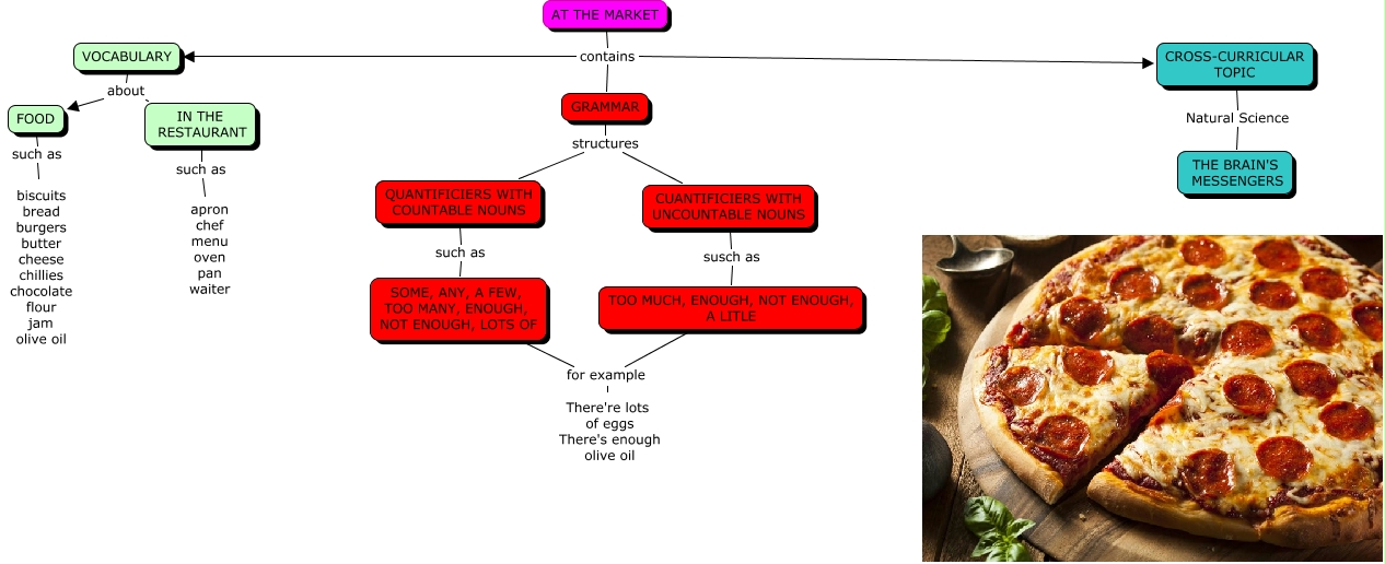 Este Cmap, tiene información relacionada con: at the market-Lucas Y Carmen, SOME, ANY, A FEW, TOO MANY, ENOUGH, NOT ENOUGH, LOTS OF for example There're lots of eggs There's enough olive oil, TOO MUCH, ENOUGH, NOT ENOUGH, A LITLE for example There're lots of eggs There's enough olive oil, CROSS-CURRICULAR TOPIC Natural Science THE BRAIN'S MESSENGERS, CUANTIFICIERS WITH UNCOUNTABLE NOUNS susch as TOO MUCH, ENOUGH, NOT ENOUGH, A LITLE, QUANTIFICIERS WITH COUNTABLE NOUNS such as SOME, ANY, A FEW, TOO MANY, ENOUGH, NOT ENOUGH, LOTS OF, IN THE RESTAURANT such as apron chef menu oven pan waiter, VOCABULARY about IN THE RESTAURANT, AT THE MARKET contains VOCABULARY, AT THE MARKET contains CROSS-CURRICULAR TOPIC, VOCABULARY about FOOD, GRAMMAR structures CUANTIFICIERS WITH UNCOUNTABLE NOUNS, GRAMMAR structures QUANTIFICIERS WITH COUNTABLE NOUNS, AT THE MARKET contains GRAMMAR, FOOD such as biscuits bread burgers butter cheese chillies chocolate flour jam olive oil