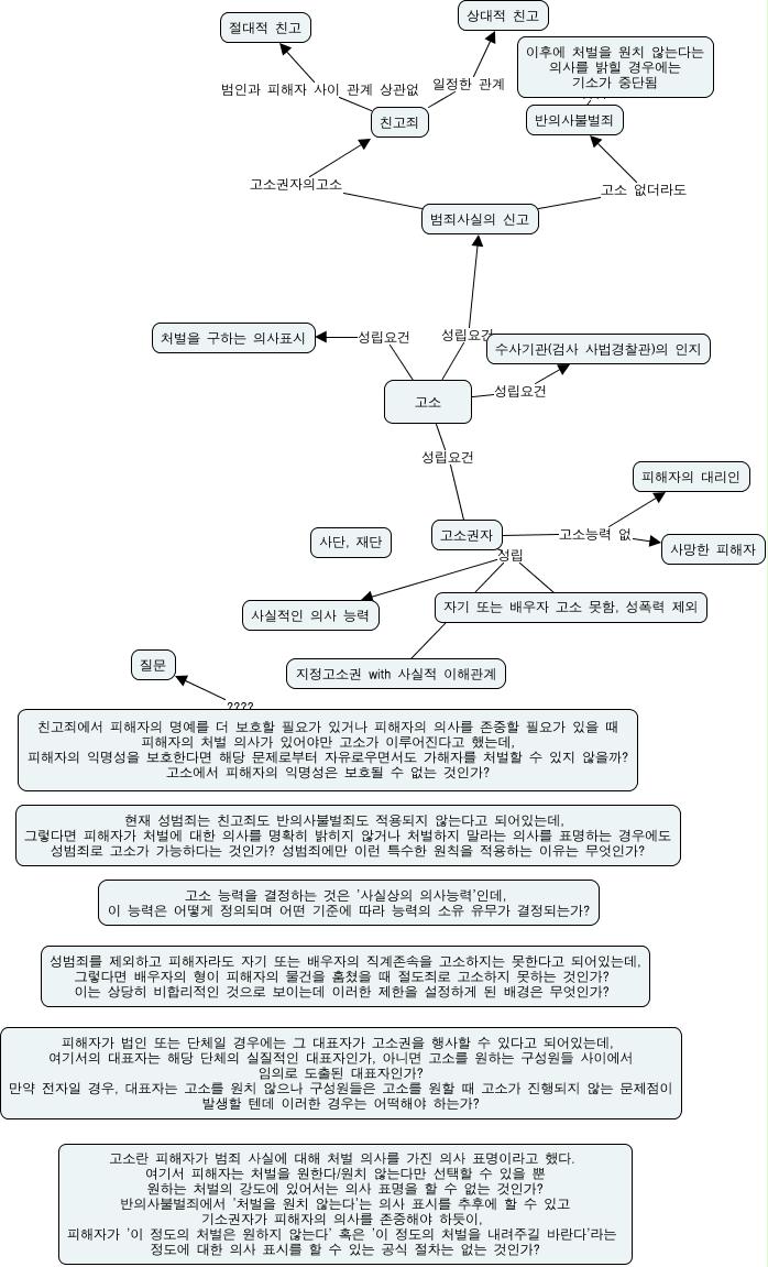 This Concept Map, created with IHMC CmapTools, has information related to: p_d_2, 친고죄에서 피해자의 명예를 더 보호할 필요가 있거나 피해자의 의사를 존중할 필요가 있을 때 피해자의 처벌 의사가 있어야만 고소가 이루어진다고 했는데, 피해자의 익명성을 보호한다면 해당 문제로부터 자유로우면서도 가해자를 처벌할 수 있지 않을까? 고소에서 피해자의 익명성은 보호될 수 없는 것인가? ???? 질문, 고소권자 성립 자기 또는 배우자 고소 못함, 성폭력 제외, 고소권자 고소능력 없 사망한 피해자, 반의사불벌죄 ???? 이후에 처벌을 원치 않는다는 의사를 밝힐 경우에는 기소가 중단됨, 고소 성립요건 범죄사실의 신고, 친고죄 일정한 관계 상대적 친고, 고소 성립요건 수사기관(검사 사법경찰관)의 인지, 범죄사실의 신고 고소권자의고소 친고죄, 고소권자 성립 사실적인 의사 능력, 고소 성립요건 고소권자, 범죄사실의 신고 고소 없더라도 반의사불벌죄, 친고죄 범인과 피해자 사이 관계 상관없 절대적 친고, 고소권자 성립 지정고소권 with 사실적 이해관계, 고소권자 고소능력 없 피해자의 대리인, 고소 성립요건 처벌을 구하는 의사표시