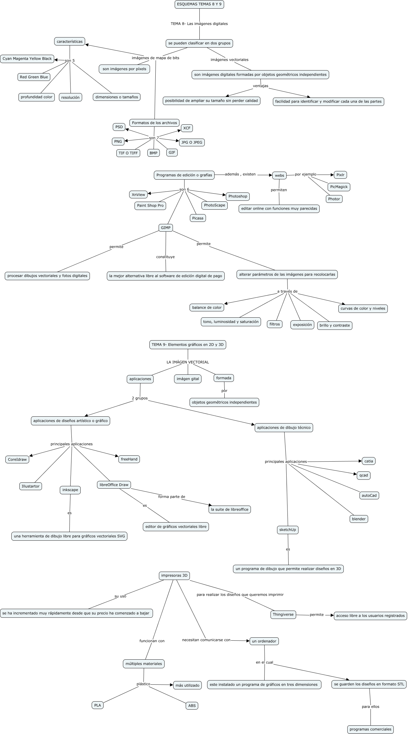 Este Cmap, tiene información relacionada con: esquemas temas 8 y 9, aplicaciones de dibujo técnico principales aplicaciones autoCad, webs por ejemplo Photor, libreOffice Draw es editor de gráficos vectoriales libre, aplicaciones de dibujo técnico principales aplicaciones blender, se guarden los diseños en formato STL para ellos programas comerciales, Formatos de los archivos son 7 BMP, TEMA 9- Elementos gráficos en 2D y 3D LA IMÁGEN VECTORIAL formada, Programas de edición o grafías son 6 XnView, aplicaciones de diseños artístico o gráfico principales aplicaciones libreOffice Draw, Formatos de los archivos son 7 XCF, aplicaciones 2 grupos aplicaciones de diseños artístico o gráfico, webs por ejemplo Pixlr, múltiples materiales plástico ABS, Formatos de los archivos son 7 PNG, formada por objetos geométricos independientes, GIMP constituye la mejor alternativa libre al software de edición digital de pago, alterar parámetros de las imágenes para recolocarlas a través de balance de color, TEMA 9- Elementos gráficos en 2D y 3D LA IMÁGEN VECTORIAL aplicaciones, un ordenador en el cual este instalado un programa de gráficos en tres dimensiones, se pueden clasificar en dos grupos imágenes de mapa de bits Formatos de los archivos