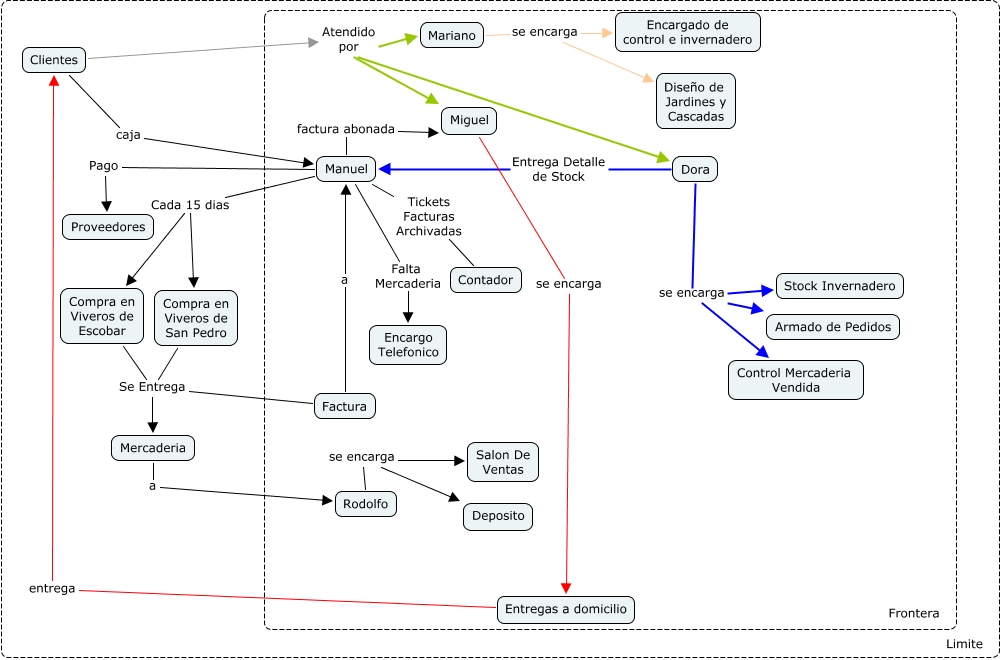 This Concept Map, created with IHMC CmapTools, has information related to: Vivero, Miguel se encarga Entregas a domicilio, Mariano se encarga Diseño de Jardines y Cascadas, Compra en Viveros de Escobar Se Entrega Compra en Viveros de San Pedro, Manuel Cada 15 dias Compra en Viveros de San Pedro, Compra en Viveros de Escobar Se Entrega Factura, Manuel Falta Mercaderia Encargo Telefonico, Mariano se encarga Encargado de control e invernadero, Rodolfo se encarga Deposito, Clientes Atendido por Mariano, Manuel Tickets Facturas Archivadas Contador, Dora se encarga Stock Invernadero, Clientes caja Manuel, Mercaderia a Rodolfo, Manuel Pago Proveedores, Dora se encarga Armado de Pedidos, Entregas a domicilio entrega Clientes, Rodolfo se encarga Salon De Ventas, Manuel factura abonada Miguel, Manuel Cada 15 dias Compra en Viveros de Escobar, Clientes Atendido por Dora