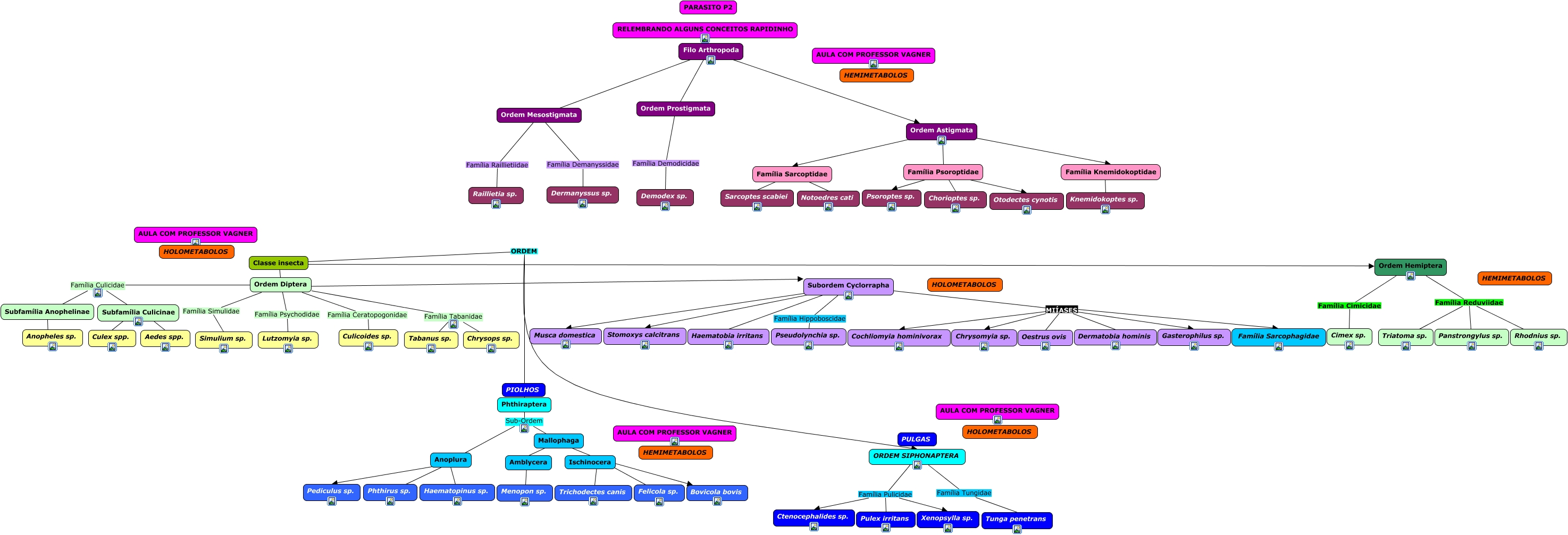 Esse mapa conceitual, produzido no IHMC CmapTools, tem a informação relacionada a: Projeto P2, Ordem Hemiptera Família Reduviidae Panstrongylus sp., Ordem Mesostigmata Família Demanyssidae Dermanyssus sp., Anoplura ???? Phthirus sp., Ordem Diptera Família Culicidae Subfamília Culicinae, Família Sarcoptidae ???? Sarcoptes scabiei, Família Sarcoptidae ???? Notoedres cati, Subfamília Culicinae ???? Culex spp., Mallophaga ???? Amblycera, Subordem Cyclorrapha ???? Stomoxys calcitrans, Ordem Diptera Família Tabanidae Tabanus sp., Subordem Cyclorrapha MIÍASES Gasterophilus sp., Ischinocera ???? Trichodectes canis, Classe insecta ???? Ordem Diptera, Subordem Cyclorrapha MIÍASES Oestrus ovis, ORDEM SIPHONAPTERA Família Pulicidae Pulex irritans, Ordem Diptera Família Simulidae Simulium sp., Filo Arthropoda ???? Ordem Astigmata, Classe insecta ORDEM Phthiraptera, Família Psoroptidae ???? Otodectes cynotis, Ordem Prostigmata Família Demodicidae Demodex sp.