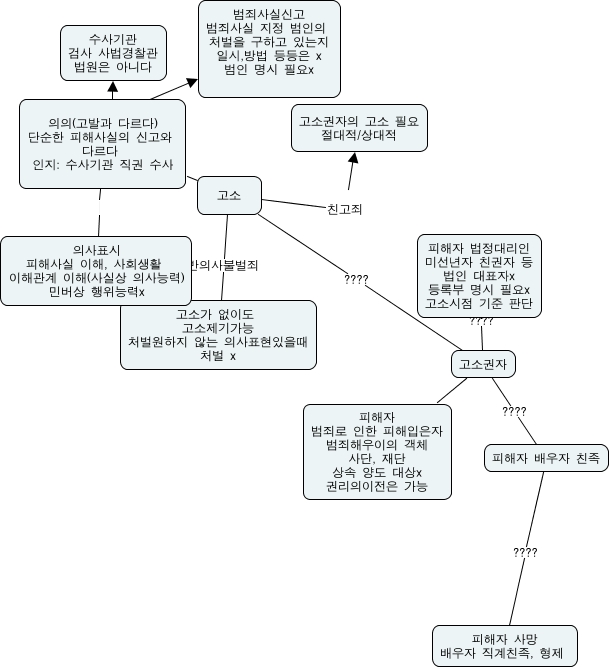 This Concept Map, created with IHMC CmapTools, has information related to: p_d_5_2, 고소권자 ???? 피해자 범죄로 인한 피해입은자 범죄해우이의 객체 사단, 재단 상속 양도 대상x 권리의이전은 가능, 고소 ???? 고소권자, 고소권자 ???? 피해자 배우자 친족, 의의(고발과 다르다) 단순한 피해사실의 신고와 다르다 인지: 수사기관 직권 수사 의사표시 피해사실 이해, 사회생활 이해관계 이해(사실상 의사능력) 민버상 행위능력x, 고소 친고죄 고소권자의 고소 필요 절대적/상대적, 피해자 배우자 친족 ???? 피해자 사망 배우자 직계친족, 형제, 고소 반의사불벌죄 고소가 없이도 고소제기가능 처벌원하지 않는 의사표현있을때 처벌 x, 의의(고발과 다르다) 단순한 피해사실의 신고와 다르다 인지: 수사기관 직권 수사 ???? 수사기관 검사 사법경찰관 법원은 아니다, 의의(고발과 다르다) 단순한 피해사실의 신고와 다르다 인지: 수사기관 직권 수사 ???? 범죄사실신고 범죄사실 지정 범인의 처벌을 구하고 있는지 일시,방법 등등은 x 범인 명시 필요x, 고소권자 ???? 피해자 법정대리인 미선년자 친권자 등 법인 대표자x 등록부 명시 필요x 고소시점 기준 판단, 고소 ???? 의의(고발과 다르다) 단순한 피해사실의 신고와 다르다 인지: 수사기관 직권 수사