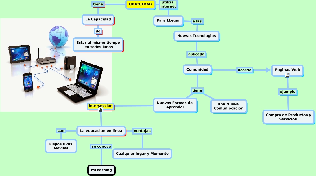 This Concept Map, created with IHMC CmapTools, has information related to: ubicuidad, Paginas Web ejemplo Compra de Productos y Servicios., UBICUIDAD tiene La Capacidad, Nuevas Tecnologias aplicada Comunidad, La Capacidad de Estar al mismo tiempo en todos lados, Comunidad tiene Una Nueva Comuniocacion, UBICUIDAD utiliza internet Para LLegar, Comunidad tiene Nuevas Formas de Aprender, Comunidad accede Paginas Web, La educacion en linea ventajas Cualquier lugar y Momento, Nuevas Formas de Aprender interseccion La educacion en linea, La educacion en linea se conoce mLearning, Para LLegar a las Nuevas Tecnologias, La educacion en linea con Dispositivos Moviles