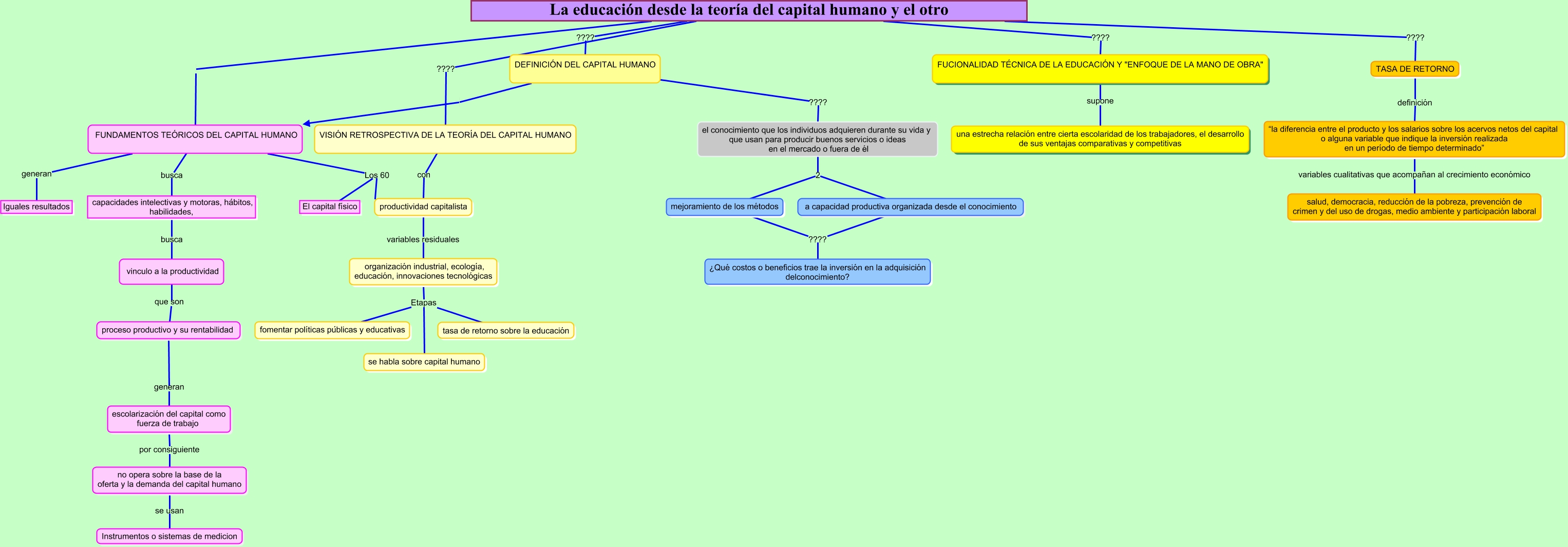 Este Cmap, tiene información relacionada con: ELEMENTOS DE LA COMUNICACIÓN, La educación desde la teoría del capital humano y el otro ???? FUCIONALIDAD TÉCNICA DE LA EDUCACIÓN Y "ENFOQUE DE LA MANO DE OBRA", TASA DE RETORNO definición “la diferencia entre el producto y los salarios sobre los acervos netos del capital o alguna variable que indique la inversión realizada en un período de tiempo determinado”, escolarización del capital como fuerza de trabajo por consiguiente no opera sobre la base de la oferta y la demanda del capital humano, organización industrial, ecología, educación, innovaciones tecnológicas Etapas tasa de retorno sobre la educación, el conocimiento que los individuos adquieren durante su vida y que usan para producir buenos servicios o ideas en el mercado o fuera de él 2 a capacidad productiva organizada desde el conocimiento, La educación desde la teoría del capital humano y el otro ???? DEFINICIÓN DEL CAPITAL HUMANO, DEFINICIÓN DEL CAPITAL HUMANO ???? el conocimiento que los individuos adquieren durante su vida y que usan para producir buenos servicios o ideas en el mercado o fuera de él, La educación desde la teoría del capital humano y el otro ???? TASA DE RETORNO, a capacidad productiva organizada desde el conocimiento ???? ¿Qué costos o beneficios trae la inversión en la adquisición delconocimiento?, vinculo a la productividad que son proceso productivo y su rentabilidad, VISIÓN RETROSPECTIVA DE LA TEORÍA DEL CAPITAL HUMANO con productividad capitalista, La educación desde la teoría del capital humano y el otro ???? VISIÓN RETROSPECTIVA DE LA TEORÍA DEL CAPITAL HUMANO, proceso productivo y su rentabilidad generan escolarización del capital como fuerza de trabajo, FUNDAMENTOS TEÓRICOS DEL CAPITAL HUMANO busca capacidades intelectivas y motoras, hábitos, habilidades,, FUNDAMENTOS TEÓRICOS DEL CAPITAL HUMANO generan Iguales resultados, FUNDAMENTOS TEÓRICOS DEL CAPITAL HUMANO Los 60 productividad capitalista, productividad capitalista variables residuales organización industrial, ecología, educación, innovaciones tecnológicas, organización industrial, ecología, educación, innovaciones tecnológicas Etapas se habla sobre capital humano, “la diferencia entre el producto y los salarios sobre los acervos netos del capital o alguna variable que indique la inversión realizada en un período de tiempo determinado” variables cualitativas que acompañan al crecimiento económico salud, democracia, reducción de la pobreza, prevención de crimen y del uso de drogas, medio ambiente y participación laboral, FUNDAMENTOS TEÓRICOS DEL CAPITAL HUMANO Los 60 El capital físico