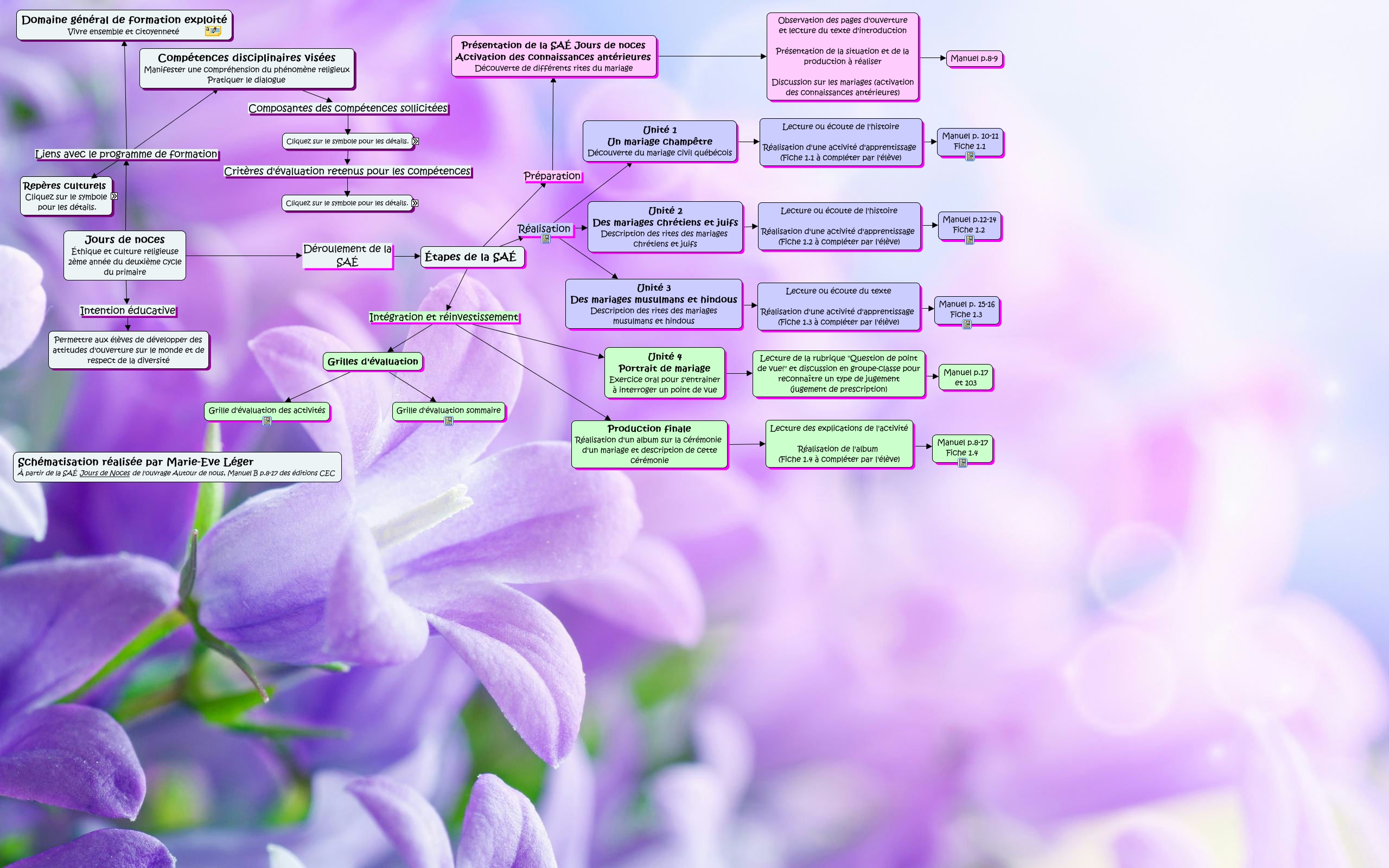 Cette carte de concepts créée avec IHMC CmapTools traite de: Léger Marie-Eve, Étapes de la SAÉ Réalisation Unité 1 Un mariage champêtre Découverte du mariage civil québécois, Pratiquer le dialogue Organiser sa pensée Interagir avec les autres Élaborer un point de vue, Jours de noces Éthique et culture religieuse 2ème année du deuxième cycle du primaire Liens avec le programme de formation Repères culturels, Production finale Réalisation d'un album sur la cérémonie d'un mariage et description de cette cérémonie Lecture des explications de l'activité Réalisation de l'album (Fiche 1.4 à compléter par l'élève), Étapes de la SAÉ Réalisation Unité 2 Des mariages chrétiens et juifs Description des rites des mariages chrétiens et juifs, Lecture des explications de l'activité Réalisation de l'album (Fiche 1.4 à compléter par l'élève) Manuel p.8-17 Fiche 1.4, Unité 4 Portrait de mariage Exercice oral pour s'entrainer à interroger un point de vue Lecture de la rubrique "Question de point de vue!" et discussion en groupe-classe pour reconnaître un type de jugement (jugement de prescription), Compétences disciplinaires visées Manifester une compréhension du phénomène religieux Pratiquer le dialogue Composantes des compétences sollicitées Manifester une compréhension du phénomène religieux, Lecture ou écoute de l'histoire Réalisation d'une activité d'apprentissage (Fiche 1.1 à compléter par l'élève) ???? Manuel p. 10-11 Fiche 1.1, Présentation de la SAÉ Jours de noces Activation des connaissances antérieures Découverte de différents rites du mariage Observation des pages d'ouverture et lecture du texte d'introduction Présentation de la situation et de la production à réaliser Discussion sur les mariages (activation des connaissances antérieures), Cliquez sur le symbole pour les détails. Critères d'évaluation retenus pour les compétences Pratiquer le dialogue, Grilles d'évaluation Grille d'évaluation sommaire, Manifester une compréhension du phénomène religieux Explorer des expressions du religieux Établir des liens entre des expressions du religieux et de l'environnement social et culturel Considérer une diversité de façons de penser, d'être et d'agir, Pratiquer le dialogue Présentation d'un point de vue élaboré à partir d'éléments pertinents, Jours de noces Éthique et culture religieuse 2ème année du deuxième cycle du primaire Liens avec le programme de formation Domaine général de formation exploité Vivre ensemble et citoyenneté, Étapes de la SAÉ Préparation Présentation de la SAÉ Jours de noces Activation des connaissances antérieures Découverte de différents rites du mariage, Manifester une compréhension du phénomène religieux Connaissance en contexte d'expressions du religieux, Unité 3 Des mariages musulmans et hindous Description des rites des mariages musulmans et hindous Lecture ou écoute du texte Réalisation d'une activité d'apprentissage (Fiche 1.3 à compléter par l'élève), Compétences disciplinaires visées Manifester une compréhension du phénomène religieux Pratiquer le dialogue Composantes des compétences sollicitées Pratiquer le dialogue, Repères culturels 1) Les célébrations et coutumes du mariage civil québécois, des mariages chrétien, juif, musulman et hindou 2) Des écrits (Code civil du Québec, Bible, Torah, Coran) 3) Des lieux de célébration de mariage et des lieux de culte (nature, palais de justice, église, synagogue, Grand Temple des Juifs à Jérusalem, mosquée, maison de la mariée ou du marié) 4) Des célébrants (prêtre, rabbin, imam, représentant autorisé par la loi) 5) Des pratiques rituelles liées au mariage
