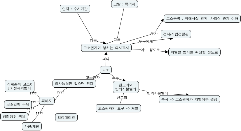 This Concept Map, created with IHMC CmapTools, has information related to: p_d_10_3, 고소권자가 행하는 의사표시 어느 정도로 처벌할 범죄를 확정할 정도로, 고소권자가 행하는 의사표시 누가 고소능력 : 피해사실 인지, 사회상 관계 이해, 고발 : 목격자 다름 고소권자가 행하는 의사표시, 피해자 ???? 보호법익 주체, 피해자 ???? 범죄행위 객체, 친고죄와 반의사불벌죄 친고죄 고소권자의 요구 -> 처벌, 친고죄와 반의사불벌죄 반의사불벌죄 수사 -> 고소권자가 처벌여부 결정, 의사능력만 있으면 된다 ???? 피해자, 고소 특수 친고죄와 반의사불벌죄, 고소 고소권자 의사능력만 있으면 된다, 피해자 ???? 직계존속 고소X cf) 성폭력범죄, 고소 의의 고소권자가 행하는 의사표시, 고소권자가 행하는 의사표시 누구에게 검사/사법경찰관, 피해자 ???? 사단/재단, 인지 : 수사기관 다름 고소권자가 행하는 의사표시