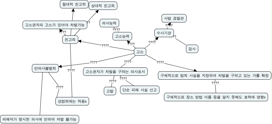 This Concept Map, created with IHMC CmapTools, has information related to: p_d_10_4, 고소권자가 처벌을 구하는 의사표시 ???? 단순 피해 사실 신고, 고소 ???? 고소권자가 처벌을 구하는 의사표시, 고소 ???? 수사기관, 수사기관 ???? 검사, 고소능력 ???? 의사능력, 반의사불벌죄 ???? 성범죄에는 적용x, 고소 ???? 친고죄, 친고죄 ???? 고소권자의 고소가 있어야 처벌가능, 친고죄 ???? 성범죄에는 적용x, 고소권자가 처벌을 구하는 의사표시 ???? 고발, 수사기관 ???? 사법 경찰관, 반의사불벌죄 ???? 피해자가 명시한 의사에 반하여 처벌 불가능, 구체적으로 범죄 사실을 지정하여 처벌을 구하고 있는 가를 확정 ???? 구체적으로 장소 방법 이름 등을 알지 못해도 효력에 영향x, 친고죄 ???? 절대적 친고죄, 고소 ???? 고소능력, 고소 ???? 구체적으로 범죄 사실을 지정하여 처벌을 구하고 있는 가를 확정, 친고죄 ???? 상대적 친고죄, 고소 ???? 반의사불벌죄
