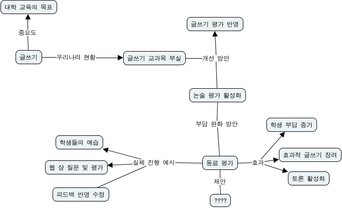 This Concept Map, created with IHMC CmapTools, has information related to: 0724_3, 글쓰기 교과목 부실 개선 방안 글쓰기 평가 반영, 동료 평가 효과 효과적 글쓰기 장려, 동료 평가 실제 진행 예시 학생들의 예습, 동료 평가 효과 토론 활성화, 동료 평가 효과 학생 부담 증가, 글쓰기 중요도 대학 교육의 목표, 동료 평가 실제 진행 예시 피드백 반영 수정, 글쓰기 교과목 부실 개선 방안 논술 평가 활성화, 글쓰기 우리나라 현황 글쓰기 교과목 부실, 논술 평가 활성화 부담 완화 방안 동료 평가, 동료 평가 제안 ????, 동료 평가 실제 진행 예시 웹 상 질문 및 평가