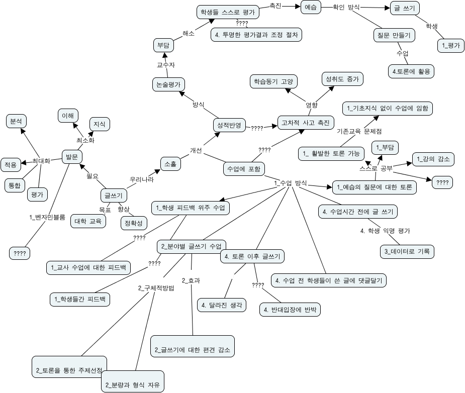 This Concept Map, created with IHMC CmapTools, has information related to: 1번, 소홀 개선 성적반영, 발문 최대화 적용, 성적반영 ???? 고차적 사고 촉진, 1_학생 피드백 위주 수업 ???? 1_학생들간 피드백, 수업에 포함 1_수업 방식 4. 수업 전 학생들이 쓴 글에 댓글달기, 소홀 개선 수업에 포함, 수업에 포함 1_수업 방식 4. 수업시간 전에 글 쓰기, 예습 확인 방식 질문 만들기, 수업에 포함 1_수업 방식 1_학생 피드백 위주 수업, 질문 만들기 수업 4.토론에 활용, 성적반영 방식 논술평가, 학생들 스스로 평가 ???? 4. 투명한 평가결과 조정 절차, 1_예습의 질문에 대한 토론 스스로 공부 1_부담, 4. 수업시간 전에 글 쓰기 4. 학생 익명 평가 3_데이터로 기록, 4. 토론 이후 글쓰기 4. 달라진 생각, 논술평가 교수자 부담, 글쓰기 목표 대학 교육, 예습 확인 방식 글 쓰기, 1_예습의 질문에 대한 토론 스스로 공부 ????, 고차적 사고 촉진 영향 학습동기 고양