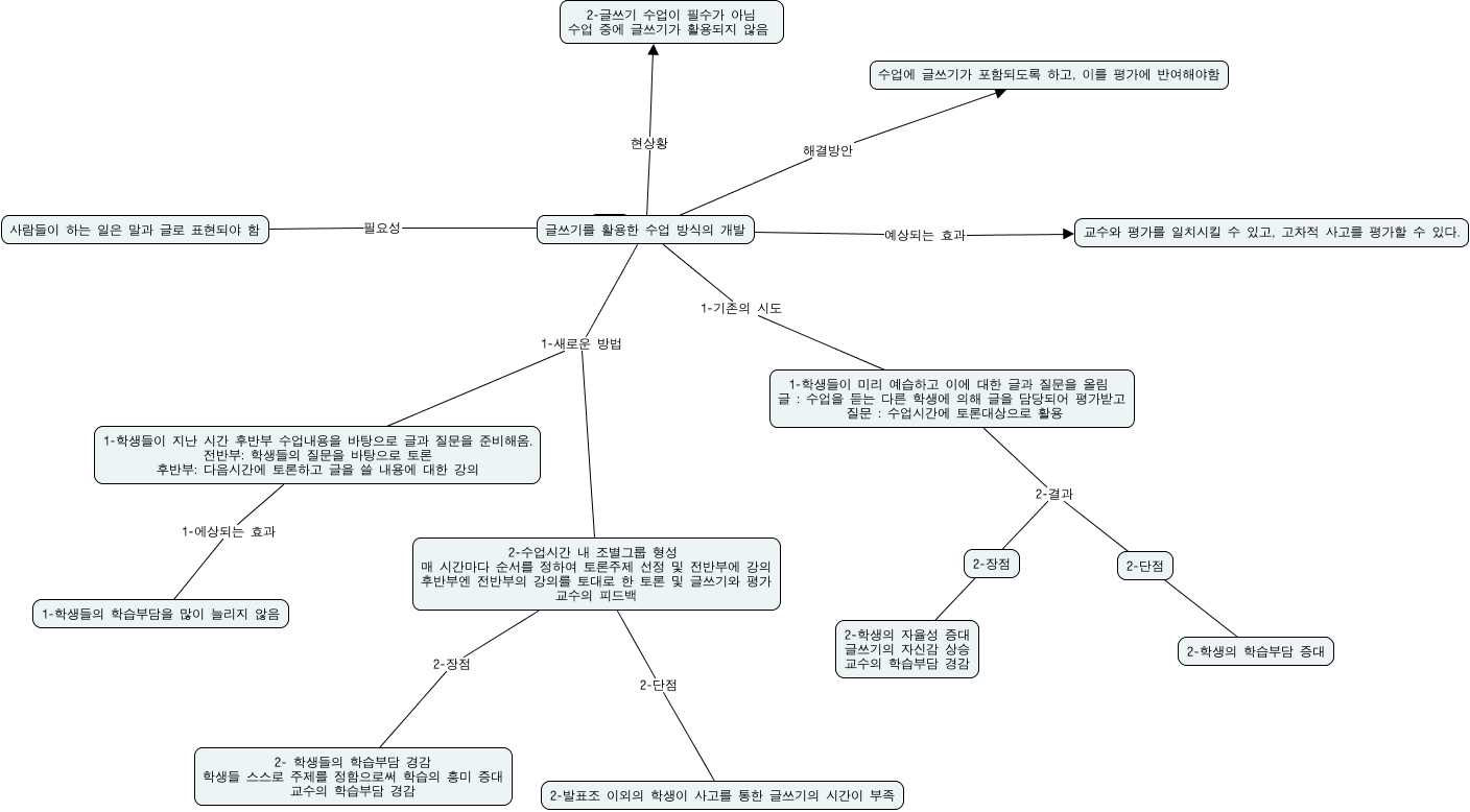 This Concept Map, created with IHMC CmapTools, has information related to: 1번, 1-학생들이 미리 예습하고 이에 대한 글과 질문을 올림 글 : 수업을 듣는 다른 학생에 의해 글을 담당되어 평가받고 질문 : 수업시간에 토론대상으로 활용 2-결과 2-학생의 학습부담 증대, 사람들이 하는 일은 말과 글로 표현되야 함 필요성 ????, 글쓰기를 활용한 수업 방식의 개발 현상황 ????, 2-수업시간 내 조별그룹 형성 매 시간마다 순서를 정하여 토론주제 선정 및 전반부에 강의 후반부엔 전반부의 강의를 토대로 한 토론 및 글쓰기와 평가 교수의 피드백 2-장점 2- 학생들의 학습부담 경감 학생들 스스로 주제를 정함으로써 학습의 흥미 증대 교수의 학습부담 경감, 글쓰기를 활용한 수업 방식의 개발 해결방안 수업에 글쓰기가 포함되도록 하고, 이를 평가에 반여해야함, 1-학생들이 미리 예습하고 이에 대한 글과 질문을 올림 글 : 수업을 듣는 다른 학생에 의해 글을 담당되어 평가받고 질문 : 수업시간에 토론대상으로 활용 2-결과 2-학생의 자율성 증대 글쓰기의 자신감 상승 교수의 학습부담 경감, 1-학생들이 지난 시간 후반부 수업내용을 바탕으로 글과 질문을 준비해옴. 전반부: 학생들의 질문을 바탕으로 토론 후반부: 다음시간에 토론하고 글을 쓸 내용에 대한 강의 1-에상되는 효과 1-학생들의 학습부담을 많이 늘리지 않음, 글쓰기를 활용한 수업 방식의 개발 1-기존의 시도 1-학생들이 미리 예습하고 이에 대한 글과 질문을 올림 글 : 수업을 듣는 다른 학생에 의해 글을 담당되어 평가받고 질문 : 수업시간에 토론대상으로 활용, 글쓰기를 활용한 수업 방식의 개발 예상되는 효과 교수와 평가를 일치시킬 수 있고, 고차적 사고를 평가할 수 있다., 2-수업시간 내 조별그룹 형성 매 시간마다 순서를 정하여 토론주제 선정 및 전반부에 강의 후반부엔 전반부의 강의를 토대로 한 토론 및 글쓰기와 평가 교수의 피드백 2-단점 2-발표조 이외의 학생이 사고를 통한 글쓰기의 시간이 부족, 글쓰기를 활용한 수업 방식의 개발 1-새로운 방법 2-수업시간 내 조별그룹 형성 매 시간마다 순서를 정하여 토론주제 선정 및 전반부에 강의 후반부엔 전반부의 강의를 토대로 한 토론 및 글쓰기와 평가 교수의 피드백, 글쓰기를 활용한 수업 방식의 개발 1-새로운 방법 1-학생들이 지난 시간 후반부 수업내용을 바탕으로 글과 질문을 준비해옴. 전반부: 학생들의 질문을 바탕으로 토론 후반부: 다음시간에 토론하고 글을 쓸 내용에 대한 강의