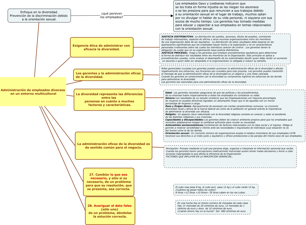 This Concept Map, created with IHMC CmapTools, has information related to: Entorno Multicultural, Enfoque en la diversidad. Prevención de la discriminación debido a la orientación sexual. Administración de empleados diversos en un entorno multicultural La administraciòn eficaz de la diversidad es de sentido comùn para el negocio., La administraciòn eficaz de la diversidad es de sentido comùn para el negocio. ???? Percepciòn: Proceso mediante el cual una persona elige, organiza e interpreta la informaciòn sensorial que recibe. Cuando los gerentes tienen percepciones relativamnete imprecisas suelen tomar malas decisiones y llevar a cabo acciones inapropiadas lo que afecta la eficiencia de la Organizaciòn. FACTORES QUE INFLUYEN EN LA PERCEPCIÒN GERENCIAL:, Exigencia ètica de administrar con eficacia la diversidad. ???? JUSTICIA DISTRIBUTIVA: La distribuciòn de sueldos, ascensos, tìtulos de puestos, comisiones de trabajo interesantes, espacios de oficina y otros recursos organizacionales entre los miembros de una organizaciòn debe de ser equitativa . La distribuciòn de estos resultados debe basarse en las aportaciones significativas que los empleados hayan hecho a la organiaciòn y no en caracterìsticas personales irrelevantes sobre las cuales los individuos carecen de control . Los gerentes tienen la obligaciòn de cuidar que en su organizaciòn haya justicia distributiva. JUSTICIA PROCESAL: Exige a los gerentes que empleen procedimientos equitativos para determinar la forma de distribuir los resultados entre los miembros de la Organizaciòn. Este principio se aplica a procedimientos usuales, como evaluar el desempeño de los subordinados decidir quien debe recibir un aumento un ascenso o quien debe ser despedido si la organizaciònse ve obligada a reducir su tamaño., Enfoque en la diversidad. Prevención de la discriminación debido a la orientación sexual. ¿qué persiven los empleados? Los empleados Gays y Lesbianas indicaron que se les trata en forma injustia se les niegan los ascensos o se les presiona para que renuncien a sus trabajos debido a su orientaciòn sexual en el lugar de trabajo, muchos optan por no divulgar ni hablar de su vida personal, ni siquiera con sus socios de mucho tiempo. Los gerentes hay tomado medidas para educar y capacitar a sus empleados en temas relacionados con la orientaciòn sexual., Enfoque en la diversidad. Prevención de la discriminación debido a la orientación sexual. Administración de empleados diversos en un entorno multicultural Los gerentes y la administraciòn eficaz de la diversidad., Enfoque en la diversidad. Prevención de la discriminación debido a la orientación sexual. Administración de empleados diversos en un entorno multicultural 28. Averiguar el dato falso (sólo uno) de un problema, dándoles la solución correcta., La diversidad representa las diferencias entre las personas en cuánto a muchos factores y características. ???? ????, Exigencia ètica de administrar con eficacia la diversidad. ???? JUSTICIA DISTRIBUTIVA: La distribuciòn de sueldos, ascensos, tìtulos de puestos, comisiones de trabajo interesantes, espacios de oficina y otros recursos organizacionales entre los miembros de una organizaciòn debe de ser equitativa . La distribuciòn de estos resultados debe basarse en las aportaciones significativas que los empleados hayan hecho a la organiaciòn y no en caracterìsticas personales irrelevantes sobre las cuales los individuos carecen de control . Los gerentes tienen la obligaciòn de cuidar que en su organizaciòn haya justicia distributiva. JUSTICIA PROCESAL: Exige a los gerentes que empleen procedimientos equitativos para determinar la forma de distribuir los resultados entre los miembros de la Organizaciòn. Este principio se aplica a procedimientos usuales, como evaluar el desempeño de los subordinados decidir quien debe recibir un aumento un ascenso o quien debe ser despedido si la organizaciònse ve obligada a reducir su tamaño., Enfoque en la diversidad. Prevención de la discriminación debido a la orientación sexual. Administración de empleados diversos en un entorno multicultural 27. Cambiar lo que sea necesario, y sólo si es necesario, de un problema para que su resolución, que se presenta, sea correcta., Los gerentes y la administraciòn eficaz de la diversidad. ???? Roles gerenciales cruciales:Los gerentes pueden promover la administraciòn eficaz de la diversidad o afectar negativamente sus esfuerzos, sus funciones son cruciales para este proceso. Los gerentes pueden transmitir el mensaje de que la administraciòn eficaz de la diversidad es un objetivo y una meta valorada. Cuando los gerentes se compremeten con la diversidad su compromiso legitima los esfuerzos de los demàs para administrar la diversidad. Los gerentes son esenciales para una administraciòn eficaz de la diversidad., Enfoque en la diversidad. Prevención de la discriminación debido a la orientación sexual. Administración de empleados diversos en un entorno multicultural La diversidad representa las diferencias entre las personas en cuánto a muchos factores y características., Enfoque en la diversidad. Prevención de la discriminación debido a la orientación sexual. Administración de empleados diversos en un entorno multicultural Exigencia ètica de administrar con eficacia la diversidad., La administraciòn eficaz de la diversidad es de sentido comùn para el negocio. ???? Percepciòn: Proceso mediante el cual una persona elige, organiza e interpreta la informaciòn sensorial que recibe. Cuando los gerentes tienen percepciones relativamnete imprecisas suelen tomar malas decisiones y llevar a cabo acciones inapropiadas lo que afecta la eficiencia de la Organizaciòn. FACTORES QUE INFLUYEN EN LA PERCEPCIÒN GERENCIAL: