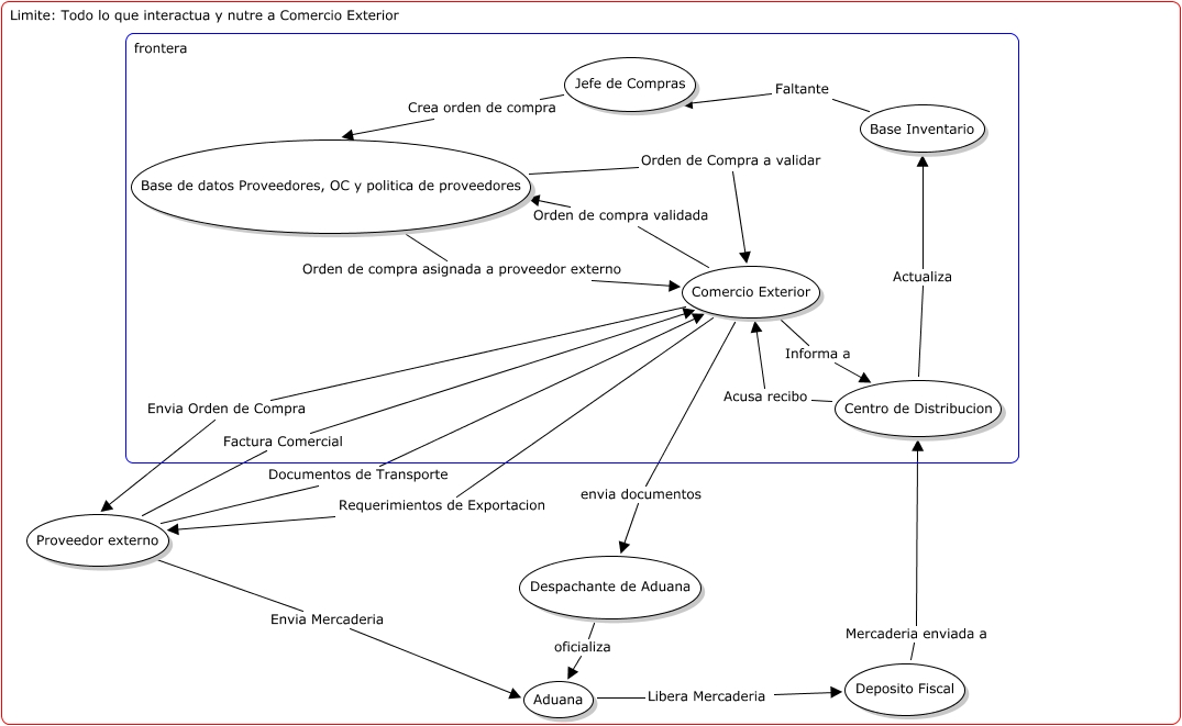 This Concept Map, created with IHMC CmapTools, has information related to: COMEX, Proveedor externo Factura Comercial Comercio Exterior, Centro de Distribucion Acusa recibo Comercio Exterior, Despachante de Aduana oficializa Aduana, Comercio Exterior Informa a Centro de Distribucion, Base de datos Proveedores, OC y politica de proveedores Orden de compra asignada a proveedor externo Comercio Exterior, Aduana Libera Mercaderia Deposito Fiscal, Comercio Exterior Requerimientos de Exportacion Proveedor externo, Deposito Fiscal Mercaderia enviada a Centro de Distribucion, Comercio Exterior Envia Orden de Compra Proveedor externo, Comercio Exterior Orden de compra validada Base de datos Proveedores, OC y politica de proveedores, Base de datos Proveedores, OC y politica de proveedores Orden de Compra a validar Comercio Exterior, Proveedor externo Documentos de Transporte Comercio Exterior, Comercio Exterior envia documentos Despachante de Aduana, Base Inventario Faltante Jefe de Compras, Proveedor externo Envia Mercaderia Aduana, Centro de Distribucion Actualiza Base Inventario, Jefe de Compras Crea orden de compra Base de datos Proveedores, OC y politica de proveedores