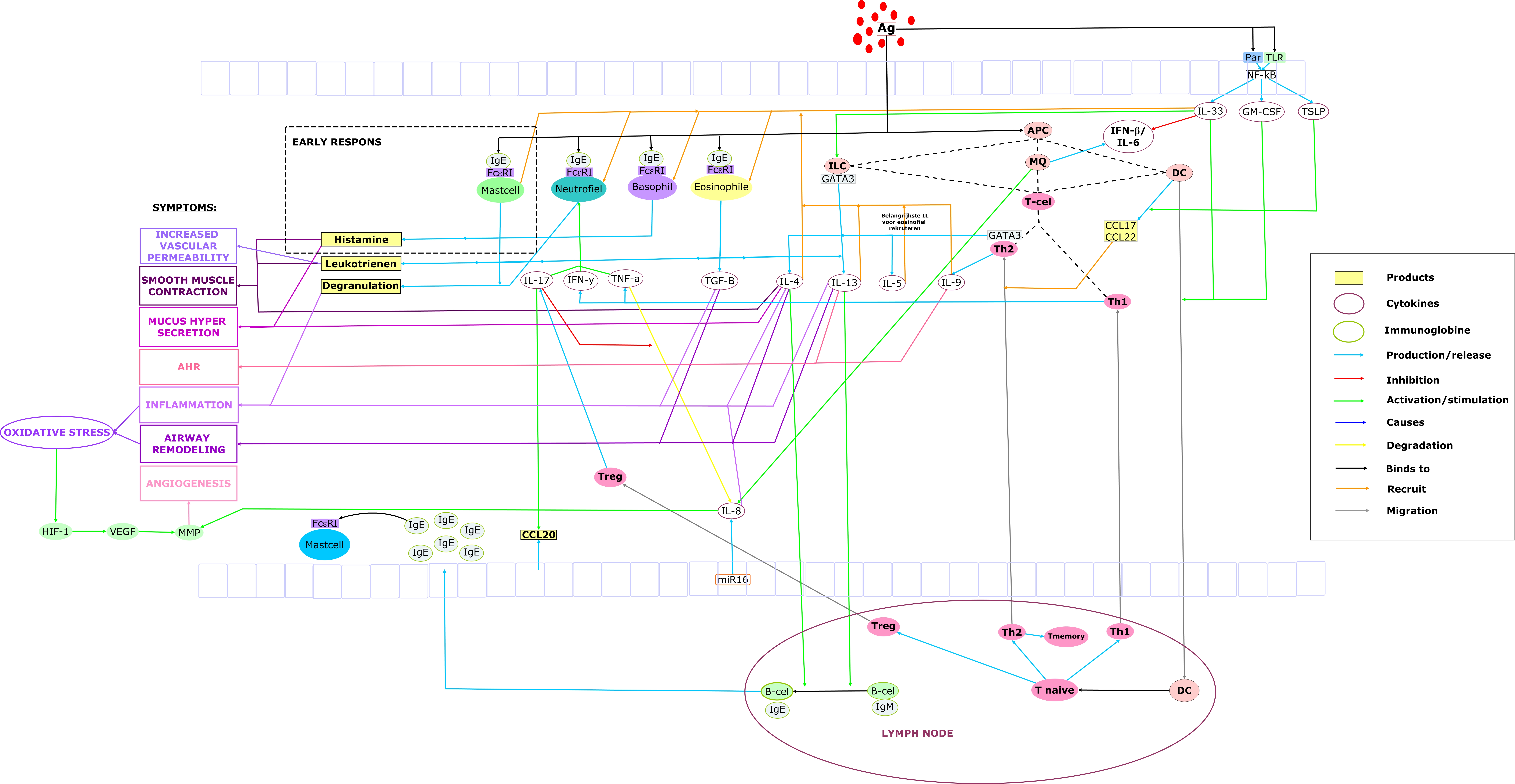 Deze Concept Map heeft informatie gerelateerd aan: astma nieuw, Ag, GM-CSF, Ag TLR, IL-17,, IL-4, ILC T-cel, IL-4, Eosinophile TGF-B,, IFN-y Neutrofiel, Leukotrienen, DC T naive, IL-8, T naive Th2, SMOOTH MUSCLE CONTRACTION,, IgE FcεRI, T naive Treg,