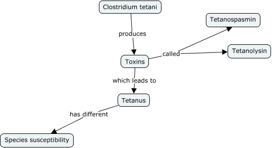 This Concept Map, created with IHMC CmapTools, has information related to: Tetanus, Toxins called Tetanospasmin, Tetanus has different Species susceptibility, Toxins which leads to Tetanus, Toxins called Tetanolysin, Clostridium tetani produces Toxins
