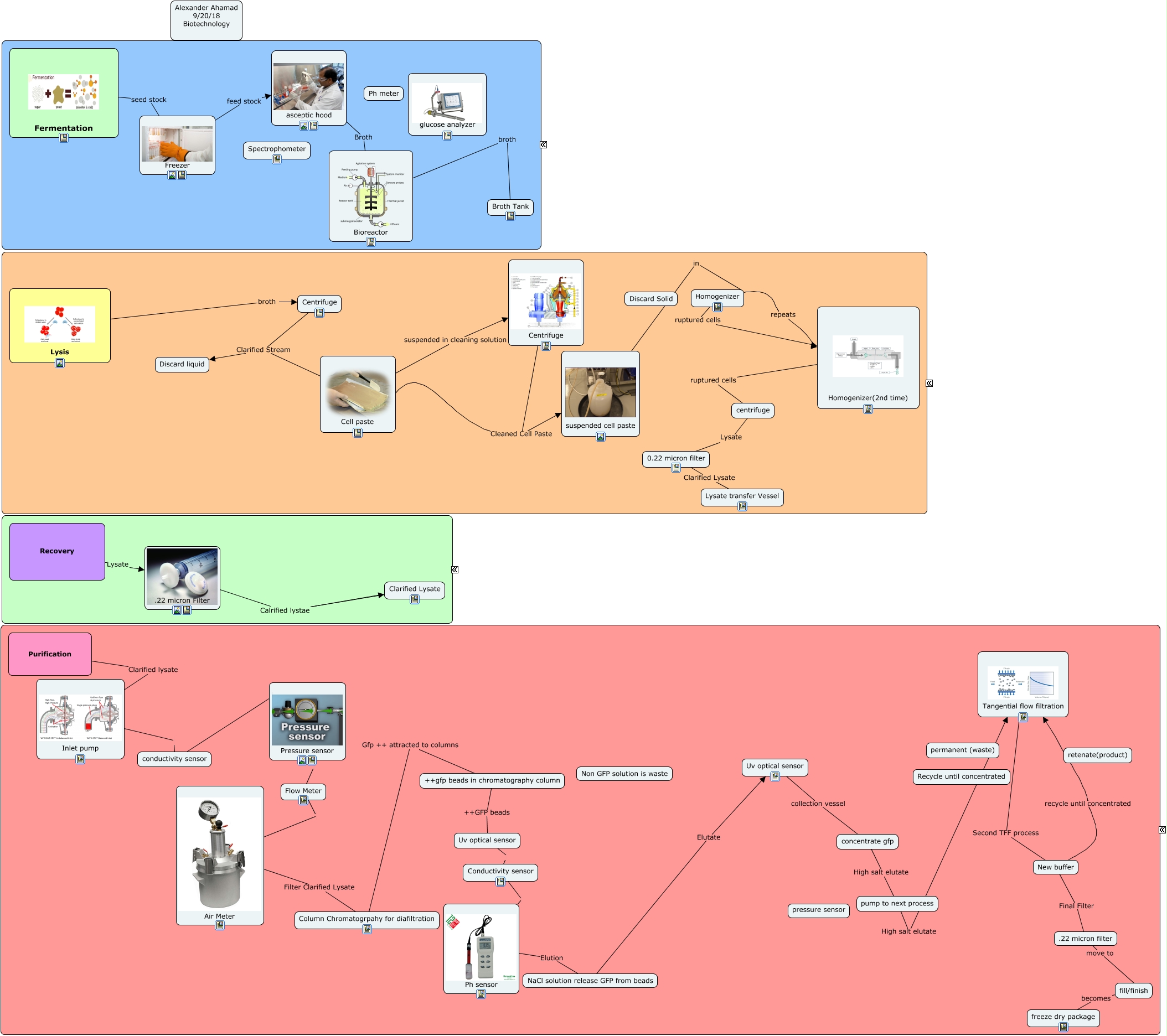 This Concept Map, created with IHMC CmapTools, has information related to: Biotechnology Facility _ AA BT F 0920, NaCl solution release GFP from beads Elutate Uv optical sensor, suspended cell paste in Homogenizer, Freezer feed stock asceptic hood, pump to next process High salt elutate Tangential flow filtration, Inlet pump conductivity sensor, Centrifuge Cleaned Cell Paste suspended cell paste, centrifuge Lysate 0.22 micron filter, Recovery Lysate .22 micron Filter, Homogenizer(2nd time) ruptured cells centrifuge, Ph sensor Elution NaCl solution release GFP from beads, Centrifuge Cleaned Cell Paste Cell paste, Fermentation seed stock Freezer, Homogenizer ruptured cells Homogenizer(2nd time), conductivity sensor Pressure sensor, Uv optical sensor Conductivity sensor, Flow Meter Air Meter, fill/finish becomes freeze dry package, Centrifuge Clarified Stream Discard liquid, Air Meter Filter Clarified Lysate Column Chromatogrpahy for diafiltration, 0.22 micron filter Clarified Lysate Lysate transfer Vessel