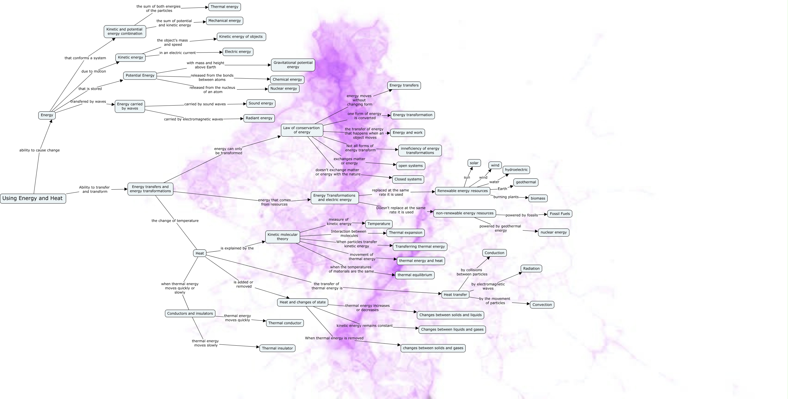 This Concept Map, created with IHMC CmapTools, has information related to: Alexandra_Navarro, Heat transfer by collisions between particles Conduction, Heat transfer by the movement of particles Convection, Energy that conforms a system Kinetic and potential energy combination, Potential Energy released from the bonds between atoms Chemical energy, Energy due to motion Kinetic energy, Law of conservartion of energy energy moves without changing form Energy transfers, Kinetic molecular theory movement of thermal energy thermal energy and heat, Energy carried by waves carried by electromagnetic waves Radiant energy, Kinetic and potential energy combination the sum of both energies of the particles Thermal energy, Using Energy and Heat Ability to transfer and transform Energy transfers and energy transformations, Conductors and insulators thermal energy moves quickly Thermal conductor, Energy Transformations and electric energy Doesn't replace at the same rate it is used non-renewable energy resources, Energy that is stored Potential Energy, Heat the transfer of thermal energy is Heat transfer, Kinetic energy in an electric current Electric energy, Heat and changes of state When thermal energy is removed changes between solids and gases, Renewable energy resources sun solar, Kinetic molecular theory Interaction between molecules Thermal expansion, Kinetic molecular theory when the temperatures of materials are the same thermal equilibrium, Law of conservartion of energy one form of energy is converted Energy transformation