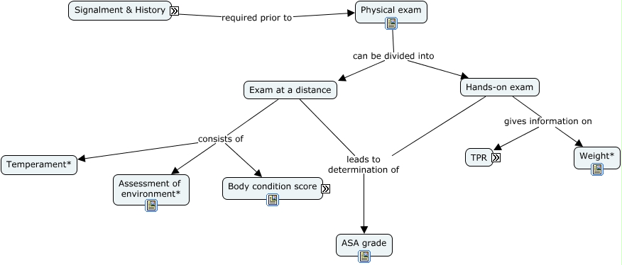 This Concept Map, created with IHMC CmapTools, has information related to: PE, Hands-on exam gives information on Weight*, Signalment & History required prior to Physical exam, Hands-on exam gives information on TPR, Exam at a distance consists of Temperament*, Exam at a distance consists of Assessment of environment*, Physical exam can be divided into Hands-on exam, Exam at a distance leads to determination of ASA grade, Physical exam can be divided into Exam at a distance, Exam at a distance consists of Body condition score, Hands-on exam leads to determination of ASA grade