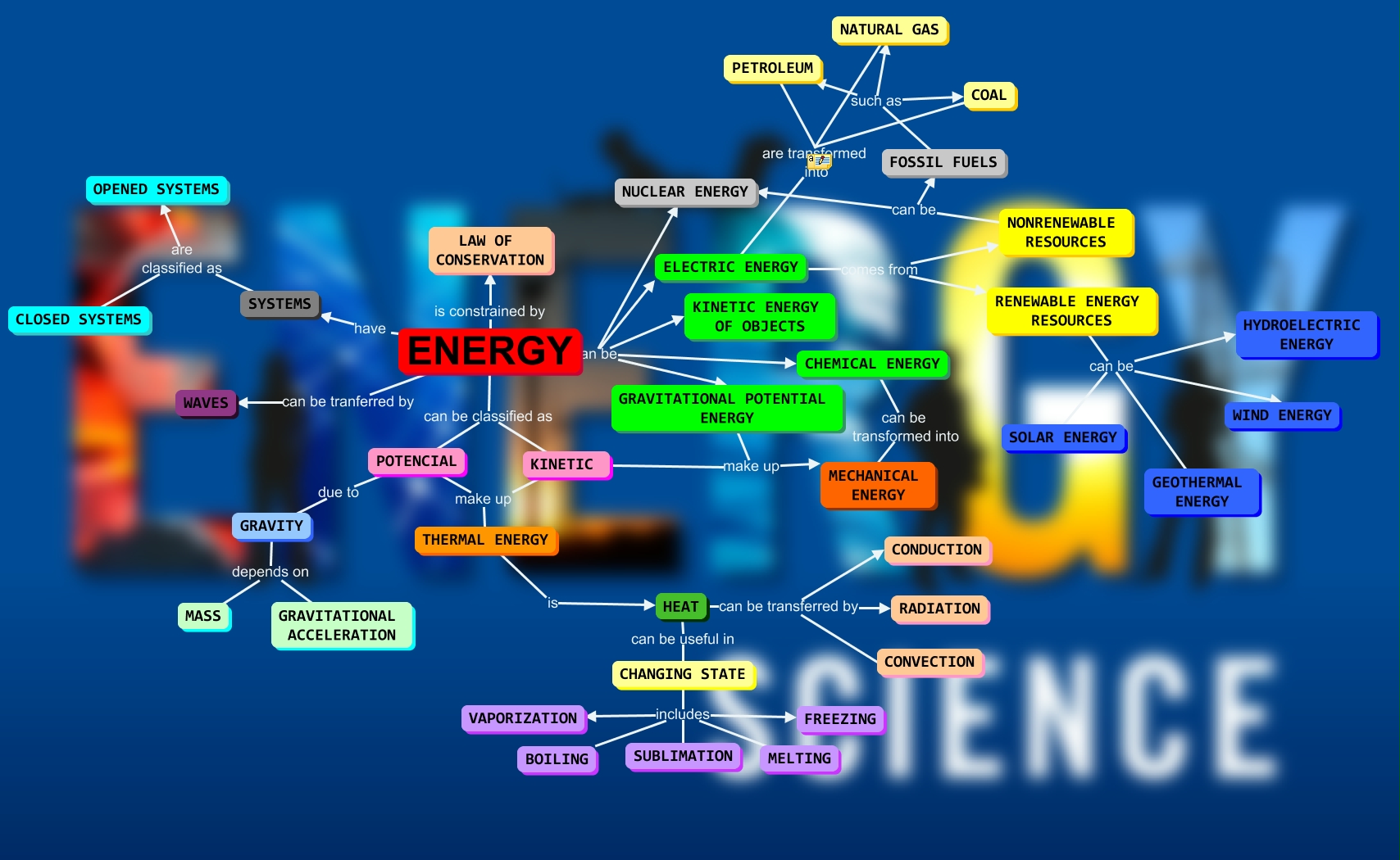 This Concept Map, created with IHMC CmapTools, has information related to: ERIKA_ZOU.cmap, ELECTRIC ENERGY comes from NONRENEWABLE RESOURCES, SYSTEMS are classified as OPENED SYSTEMS, CHANGING STATE includes BOILING, RENEWABLE ENERGY RESOURCES can be GEOTHERMAL ENERGY, HEAT can be transferred by CONDUCTION, CHANGING STATE includes MELTING, ENERGY can be GRAVITATIONAL POTENTIAL ENERGY, ENERGY can be CHEMICAL ENERGY, HEAT can be transferred by CONVECTION, ENERGY can be tranferred by WAVES, HEAT can be useful in CHANGING STATE, POTENCIAL make up THERMAL ENERGY, THERMAL ENERGY is HEAT, RENEWABLE ENERGY RESOURCES can be HYDROELECTRIC ENERGY, GRAVITY depends on GRAVITATIONAL ACCELERATION, PETROLEUM are transformed into ELECTRIC ENERGY, NONRENEWABLE RESOURCES can be FOSSIL FUELS, ENERGY can be ELECTRIC ENERGY, GRAVITY depends on MASS, CHANGING STATE includes SUBLIMATION