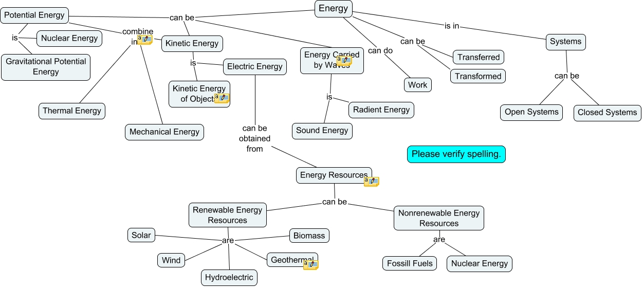 This Concept Map, created with IHMC CmapTools, has information related to: Norma_Ching.cmap, Renewable Energy Resources are Hydroelectric, Energy Resources can be Nonrenewable Energy Resources, Potential Energy is Gravitational Potential Energy, Energy can be Energy Carried by Waves, Renewable Energy Resources are Geothermal, Energy Resources can be Renewable Energy Resources, Potential Energy combine into Mechanical Energy, Energy can be Transferred, Energy Carried by Waves is Radient Energy, Potential Energy combine into Thermal Energy, Energy can be Kinetic Energy, Energy can be Transformed, Potential Energy combine into Kinetic Energy, Nonrenewable Energy Resources are Fossill Fuels, Electric Energy can be obtained from Energy Resources, Energy can do Work, Nonrenewable Energy Resources are Nuclear Energy, Renewable Energy Resources are Biomass, Energy is in Systems, Kinetic Energy is Kinetic Energy of Objects