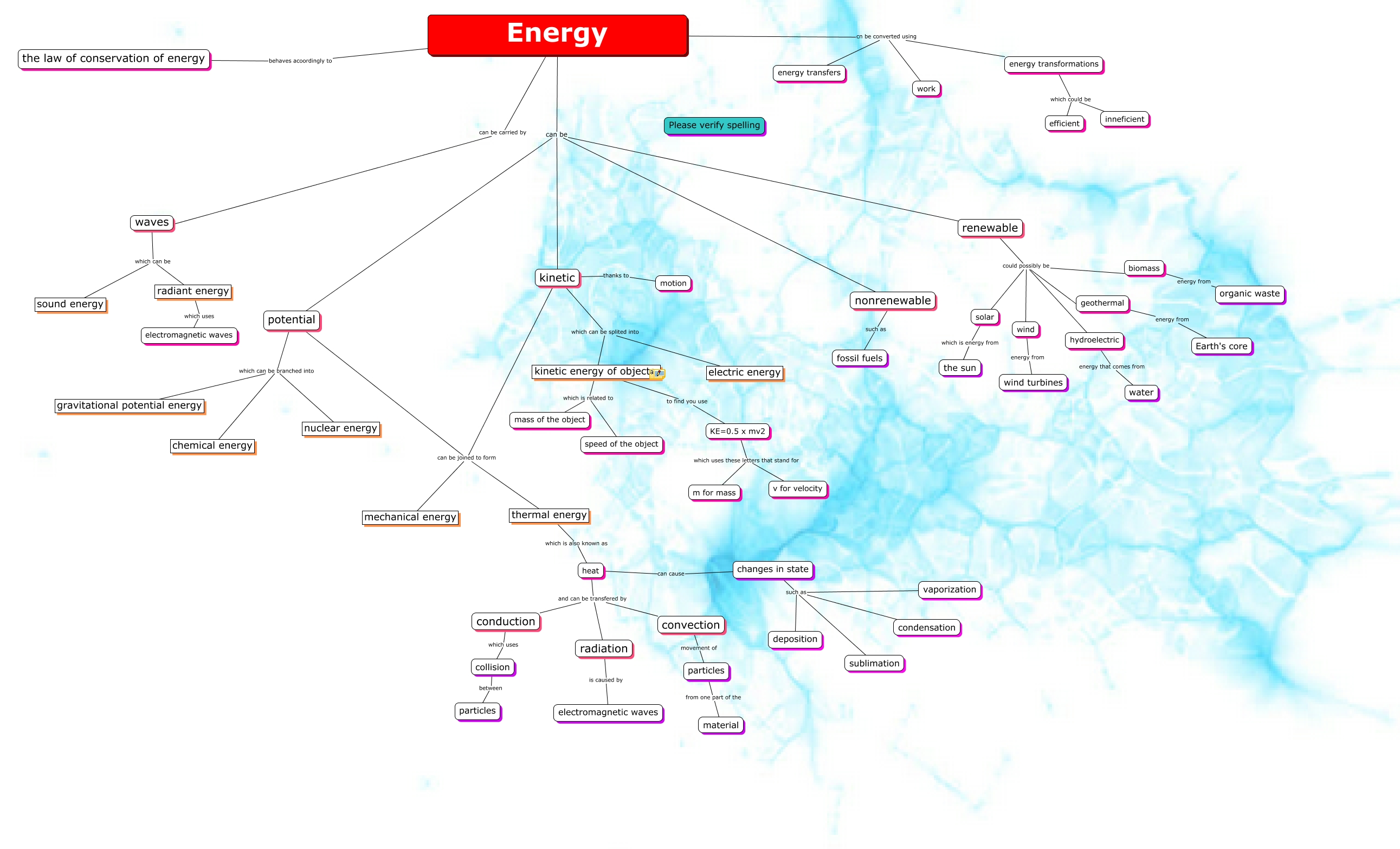 This Concept Map, created with IHMC CmapTools, has information related to: Daniella_Silvera.cmap, particles from one part of the material, radiation is caused by electromagnetic waves, conduction which uses collision, potential which can be branched into nuclear energy, kinetic can be joined to form thermal energy, thermal energy which is also known as heat, solar which is energy from the sun, Energy behaves acoordingly to the law of conservation of energy, heat can cause changes in state, collision between particles, nonrenewable such as fossil fuels, renewable could possibly be geothermal, heat and can be transfered by radiation, Energy cn be converted using energy transformations, Energy cn be converted using energy transfers, potential which can be branched into gravitational potential energy, KE=0.5 x mv2 which uses these letters that stand for m for mass, KE=0.5 x mv2 which uses these letters that stand for v for velocity, potential which can be branched into chemical energy, Energy cn be converted using work