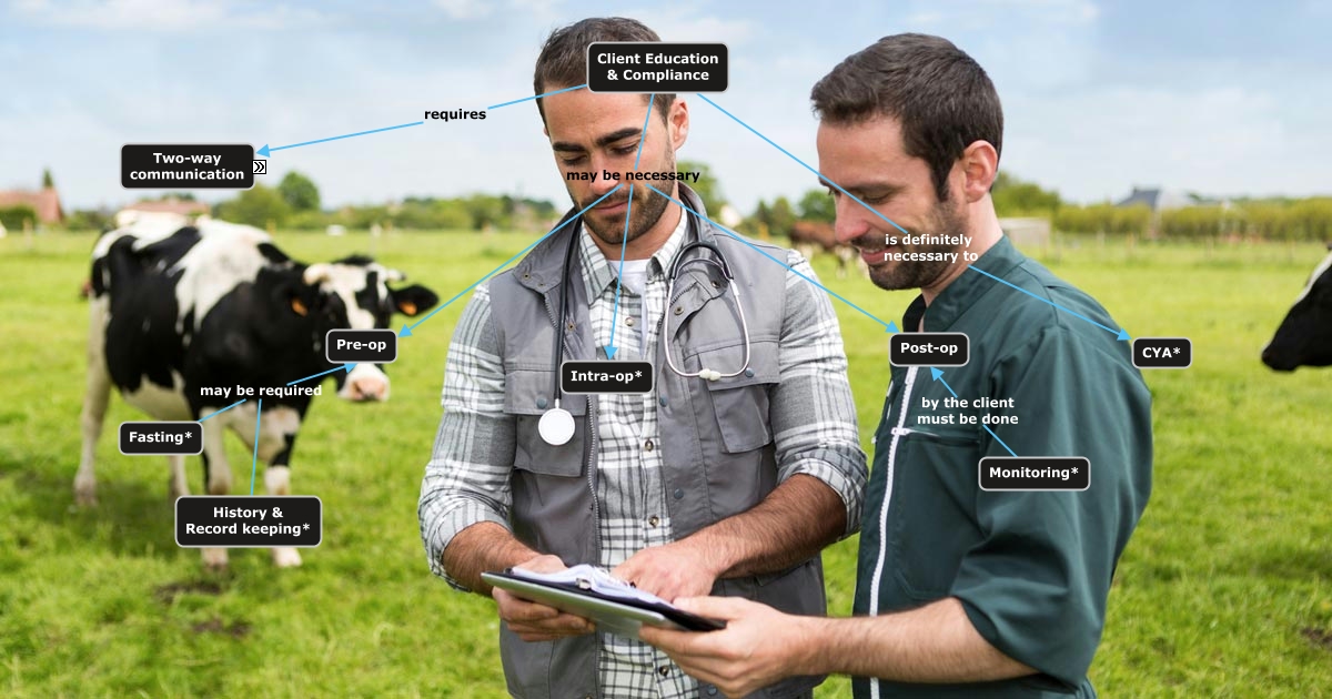 This Concept Map, created with IHMC CmapTools, has information related to: Client, Client Education & Compliance is definitely necessary to CYA*, Vet informs Client, History & Record keeping* may be required Pre-op, Client Education & Compliance requires Two-way communication, Monitoring* by the client must be done Post-op, Client informs Vet, Client Education & Compliance may be necessary Intra-op*, Fasting* may be required Pre-op, Client Education & Compliance may be necessary Pre-op, Client Education & Compliance may be necessary Post-op